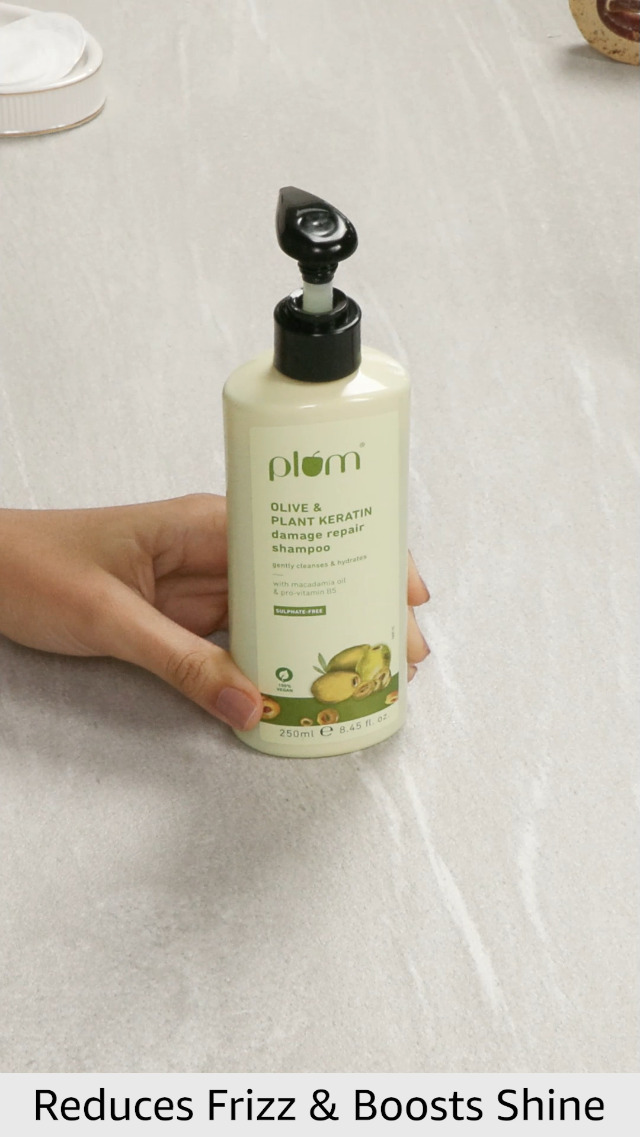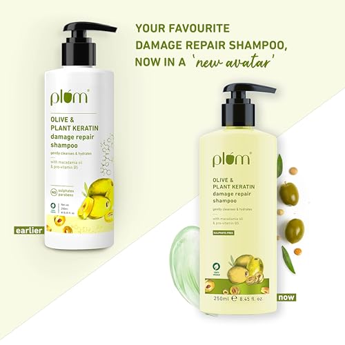 Plum Olive & Plant Keratin Damage Repair Shampoo | Sulphate-Free Shampoo | With Olive Oil, Plant Keratin, Macadamia Oil | Strengthens & Smoothens Hair, Conditions & Adds Shine to Hair | For Damaged, Salon-Treated Hair | 250 ml