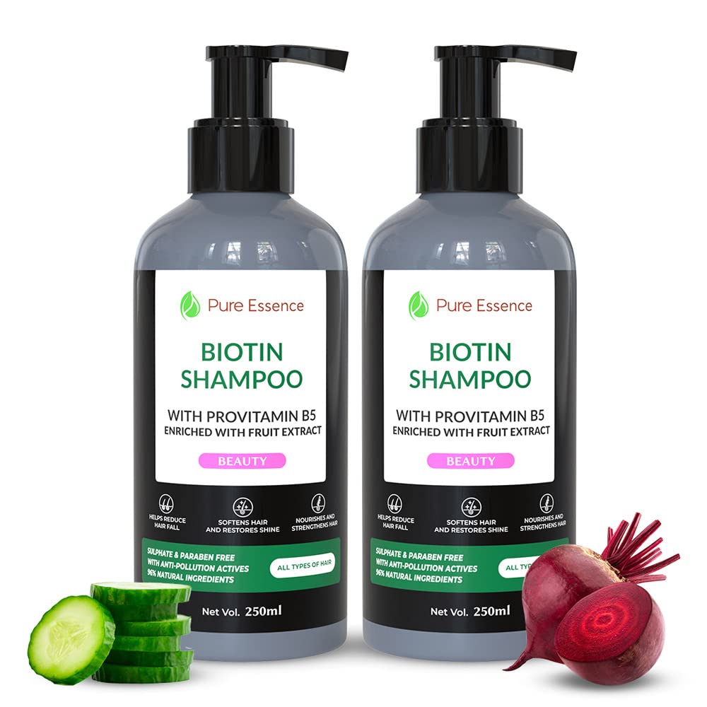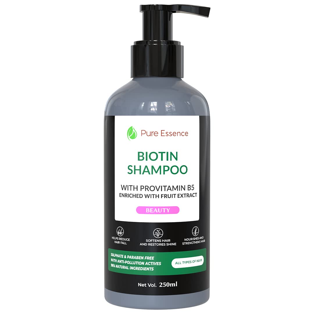Pure Essence Biotin Shampoo contains 96% Naturals al ingredients that make the shampoo safe and effective. The shampoo promotes healthy hair growth restores shine moisturizes hair increases thickness and strengthens them from root to tip. This biotin-rich shampoo is enriched with moringa seed extract that protects hair against dust pollution and UV. It does not contain harsh chemiclike sulfate phthalate or paraben. The Naturals al ingredients in the Pure Essence shampoo soften the hair and improve hair texture.