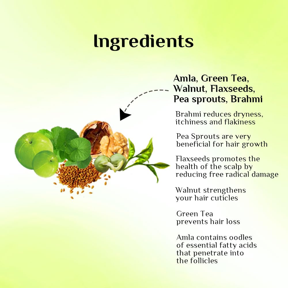 COMPLETE NUTRITION FOR YOUR HAIR: Packed with the goodness of a potent in house blend of herbs including Pea Sprout Walnuts Brahmi Amla Green Tea and Flex Seeds this provides power nutrition for your hair.