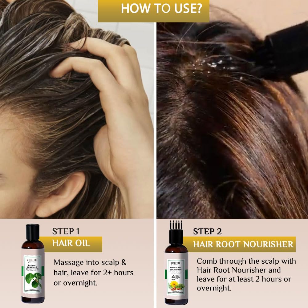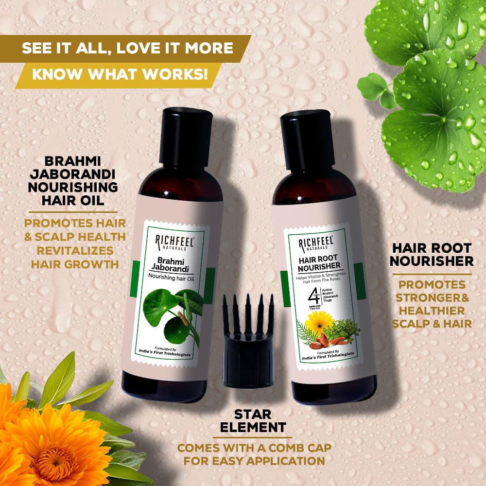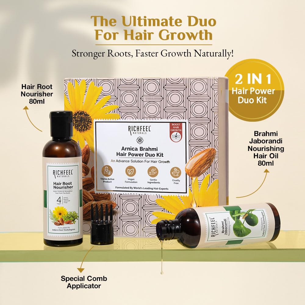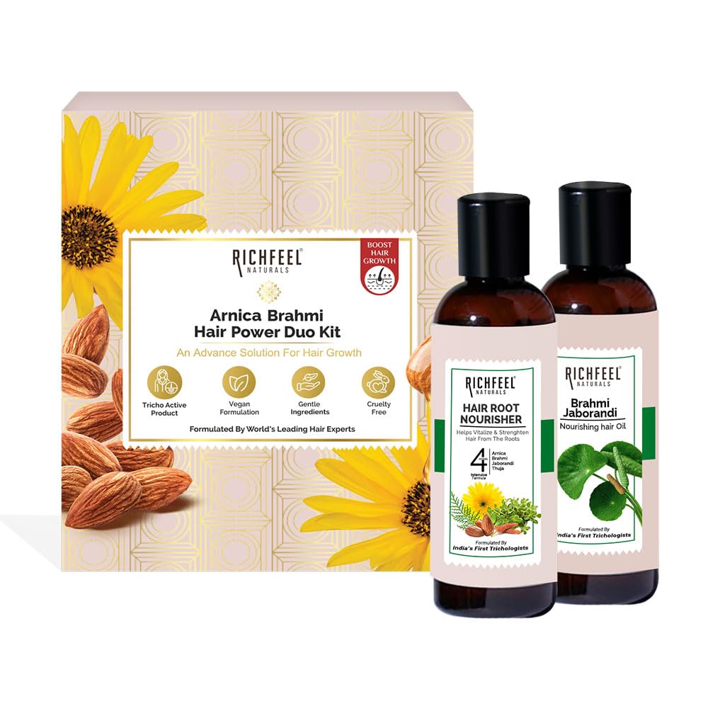 Give your hair the care it deserves with the Richfeel Arnica Brahmi Hair Power Duo Kit. This powerful combination of two premium haircare products works harmoniously to nourish your scalp and rejuvenate hair follicles for stronger shinier and healthier locks. Richfeel Brahmi Jaborandi Nourishing Hair Oil (80 ml): Formulated with the goodness of Brahmi and Jaborandi this enriching hair oil deeply nourishes the scalp reduces hair fall and promotes hair growth. Brahmi calms and strengthens the scalp while Jaborandi stimulates hair roots to enhance thickness and vitality. Richfeel Hair Root Nourisher (80 ml): Crafted with a blend of herbal extracts this root-strengthening tonic revitalizes the hair from the root preventing hair loss and dandruff. It provides essential nutrients that penetrate deeply ensuring long-term hair health and shine.