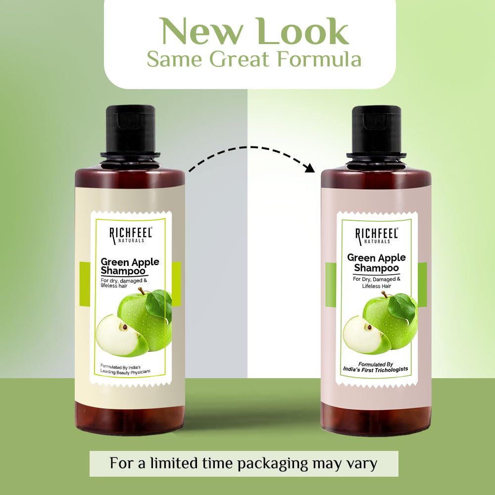 HomeHealth & PersonalHair CareOrganic Shampoos & ConditionersRichfeel Green Apple Shampoo For Dry & Damaged Hair | Anti Dandruff | Promotes Healthy Shiny and Glossy Hair | Nourishes Scalp | Makes Hair Soft & Smooth | All Skin Types | 500 ml (Pack of 2)