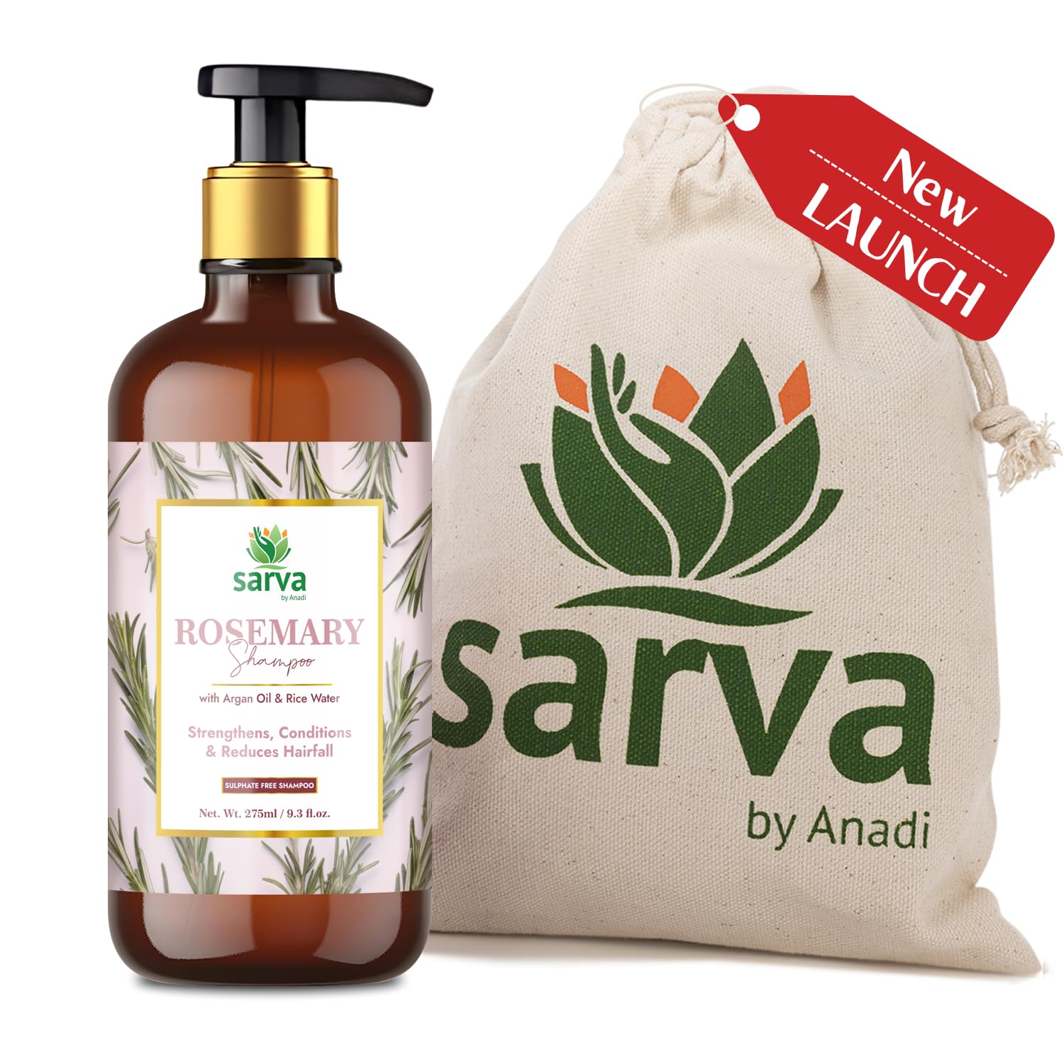 Premium Natural Formula: Sarva by Anadi rosemary shampoo blends natural rosemary extract argan oil biotin and rice water. Designed for men and women it supports a gentle sulfate-free and paraben-free routine in a 275ml pack.