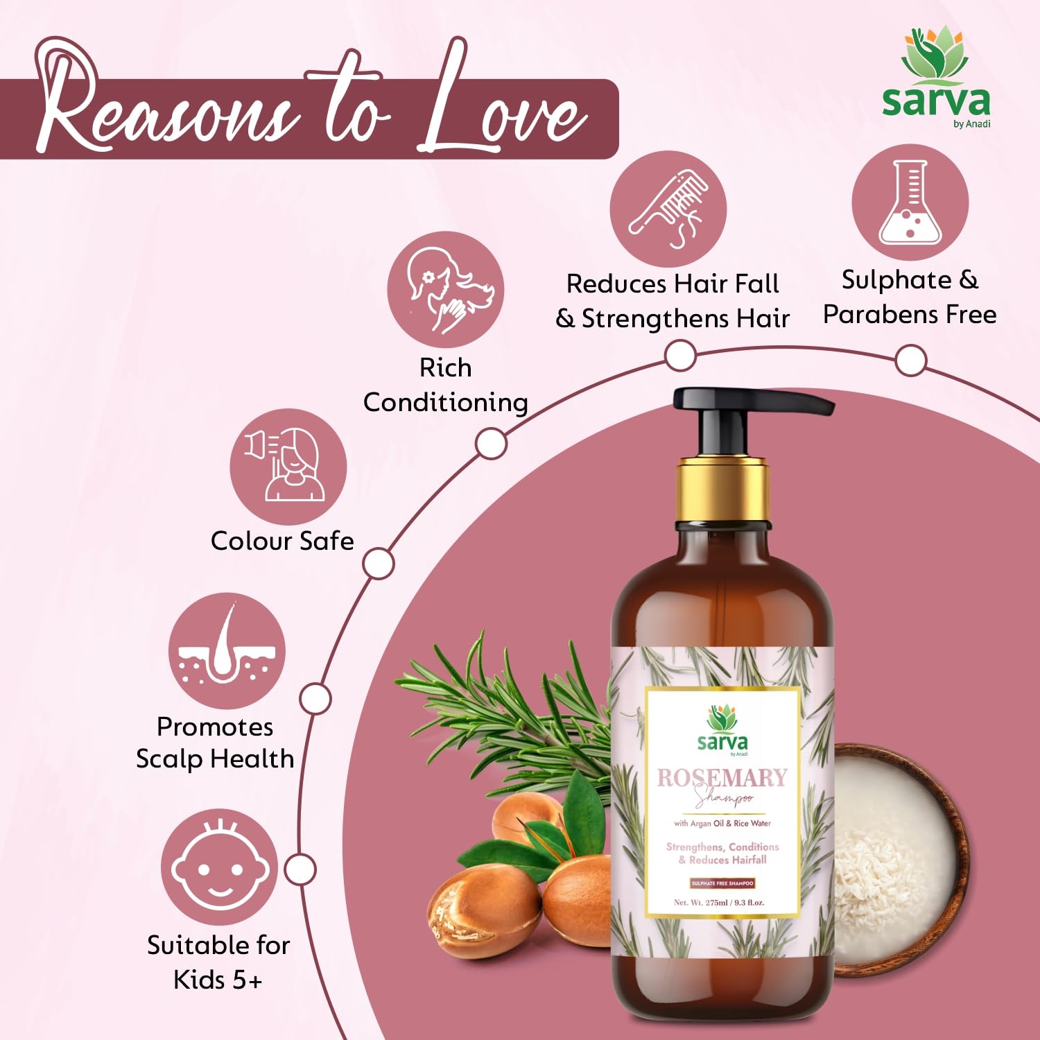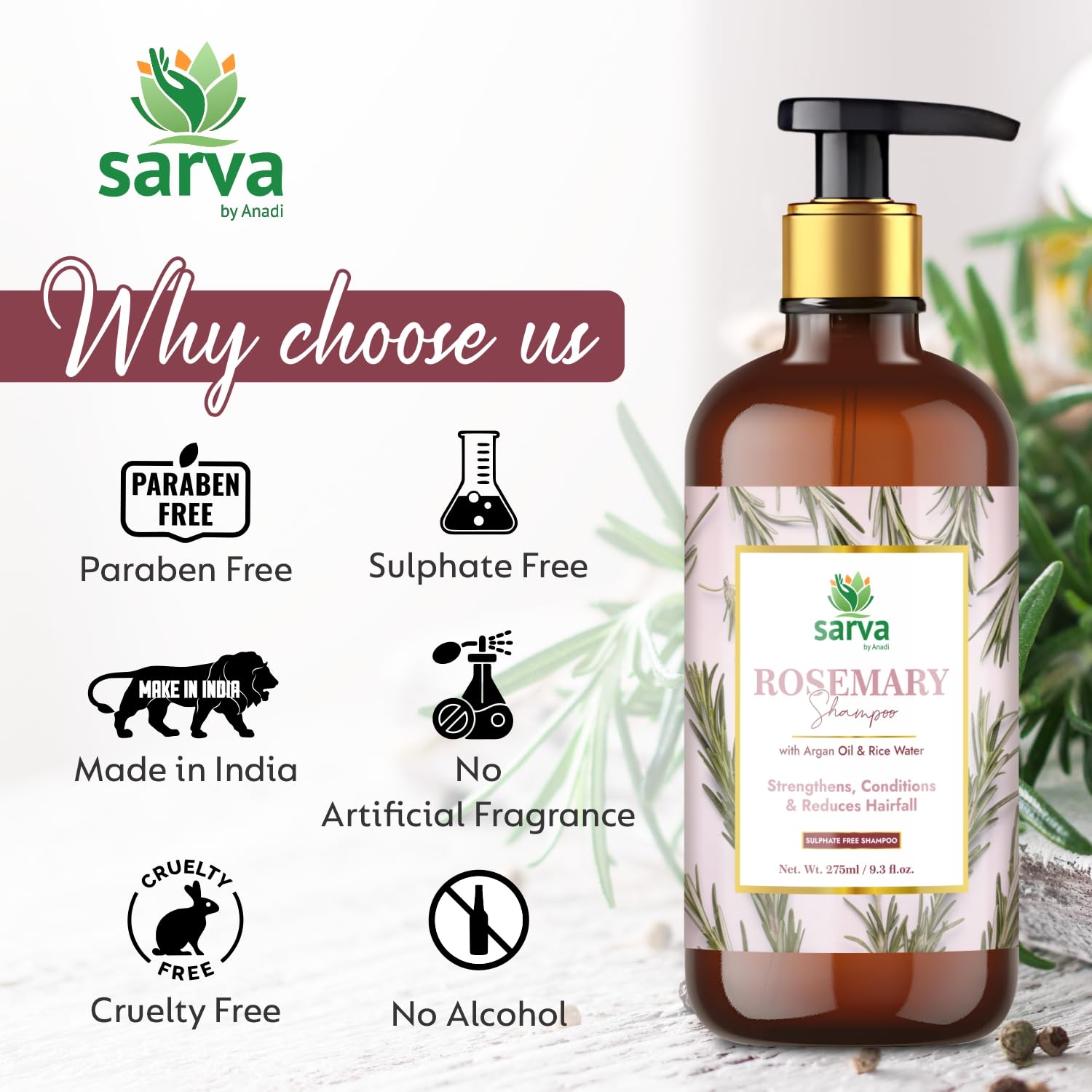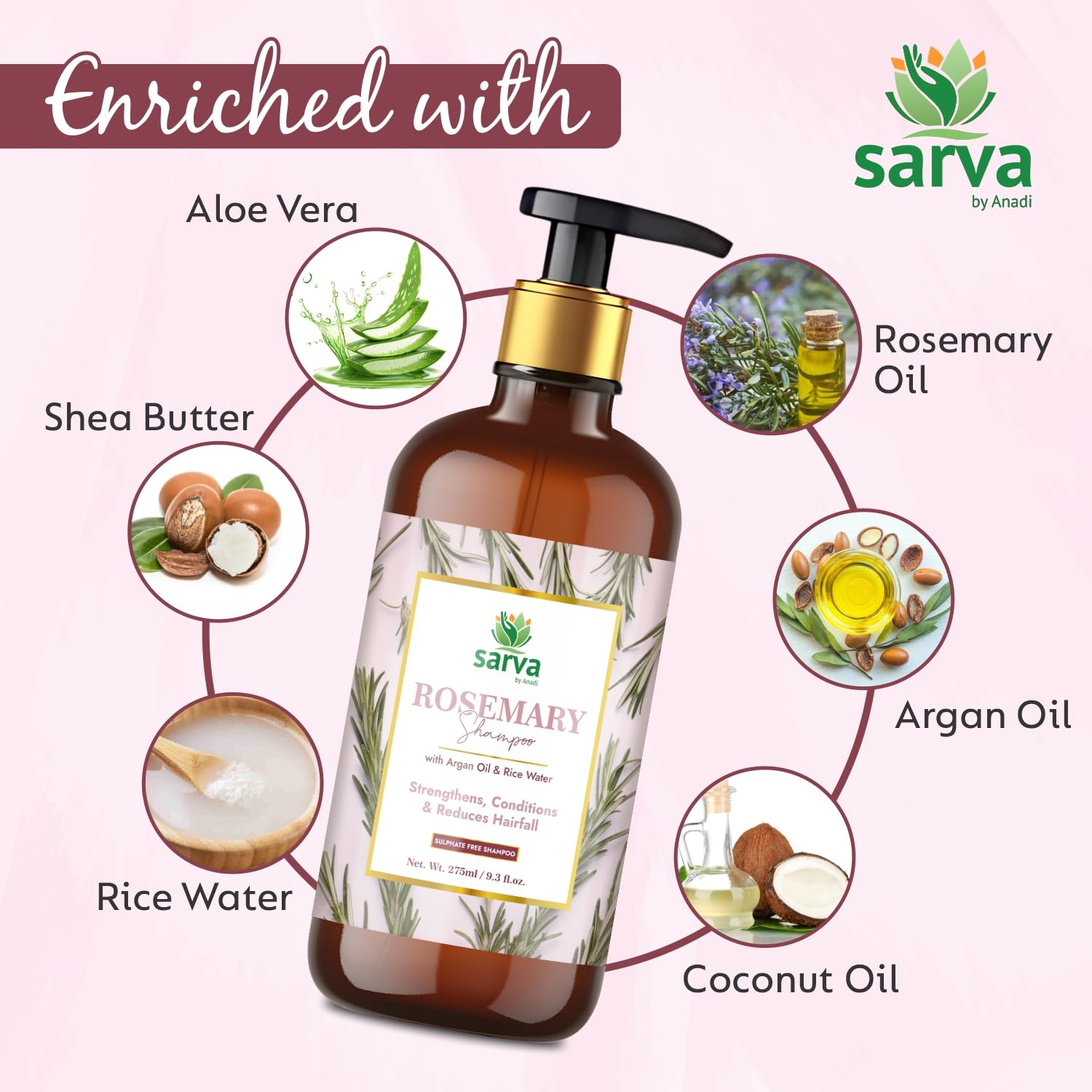 Sarva by Anadi Rosemary Shampoo with Argan Oil Biotin & Rice Water 275ml | Herbal Cleanser for Daily Hair Care | Strengthens Conditions & Reduces Hairfall | Sulphate & Paraben Free | Men and Women