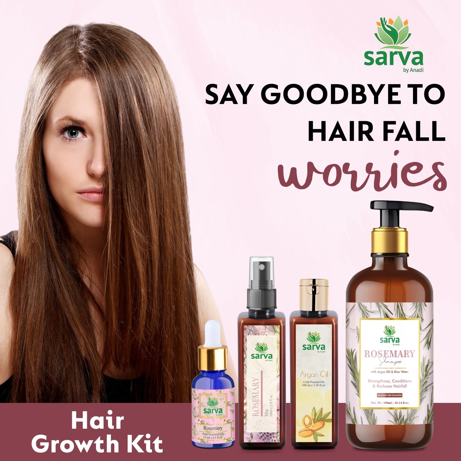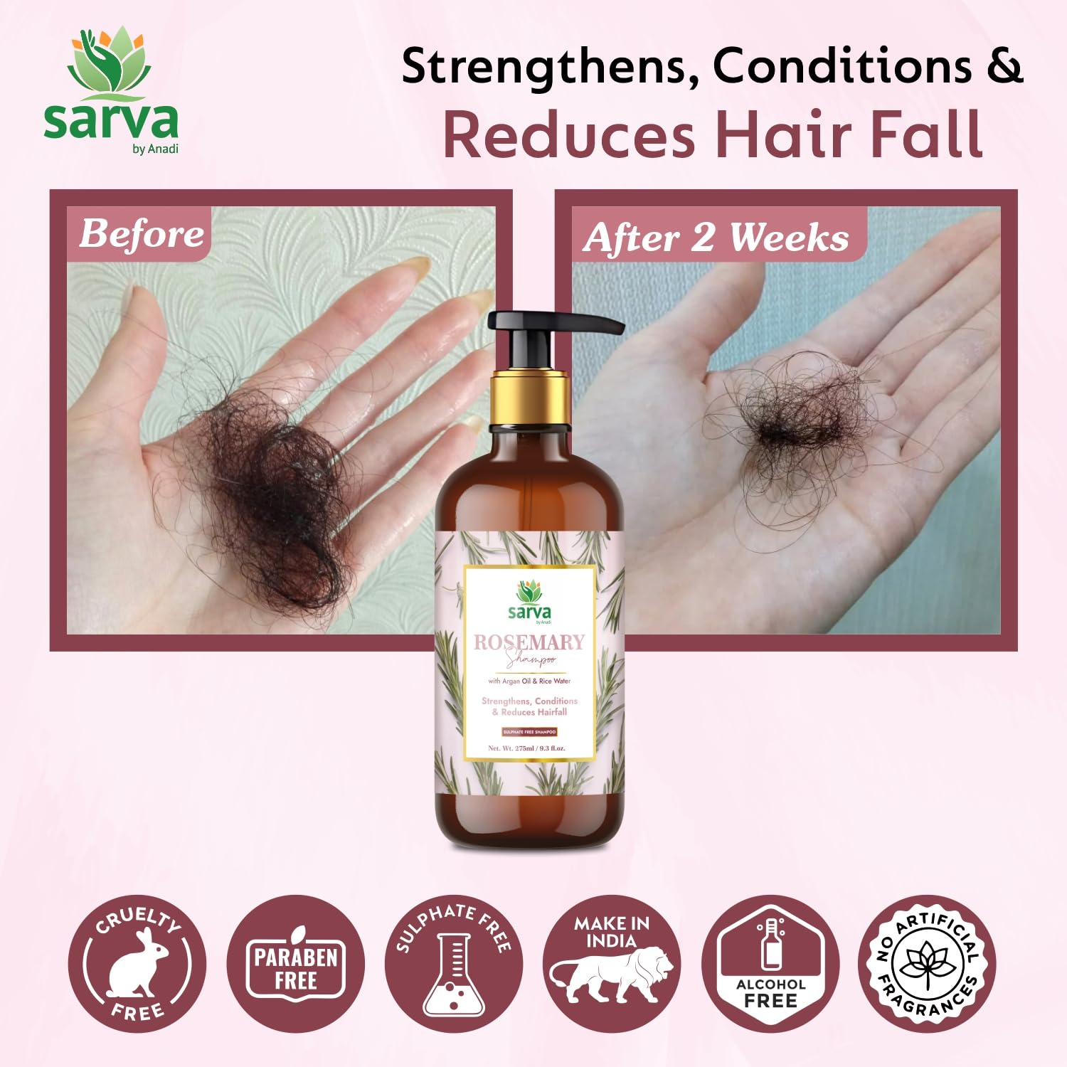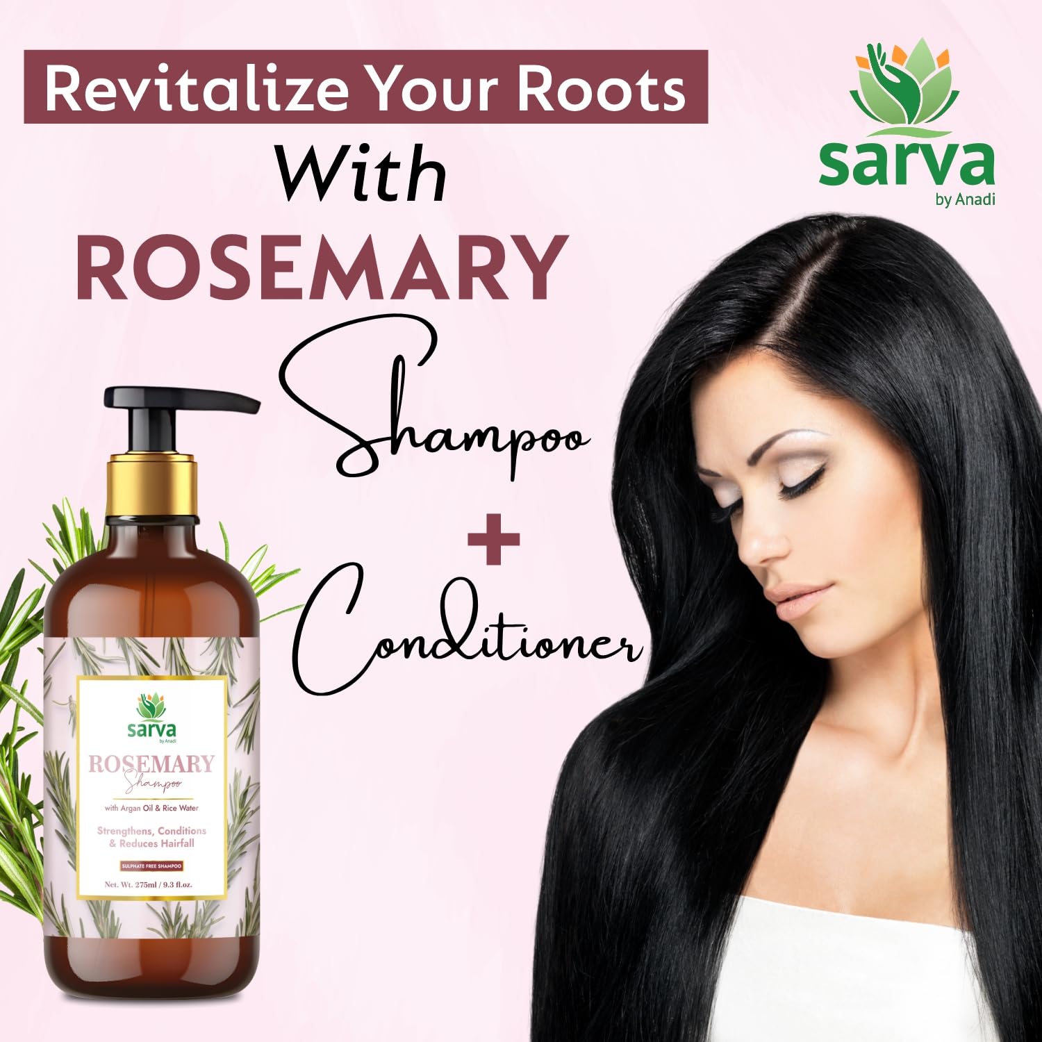 Sarva by Anadi Rosemary Shampoo with Argan Oil Biotin & Rice Water 275ml | Herbal Cleanser for Daily Hair Care | Strengthens Conditions & Reduces Hairfall | Sulphate & Paraben Free | Men and Women