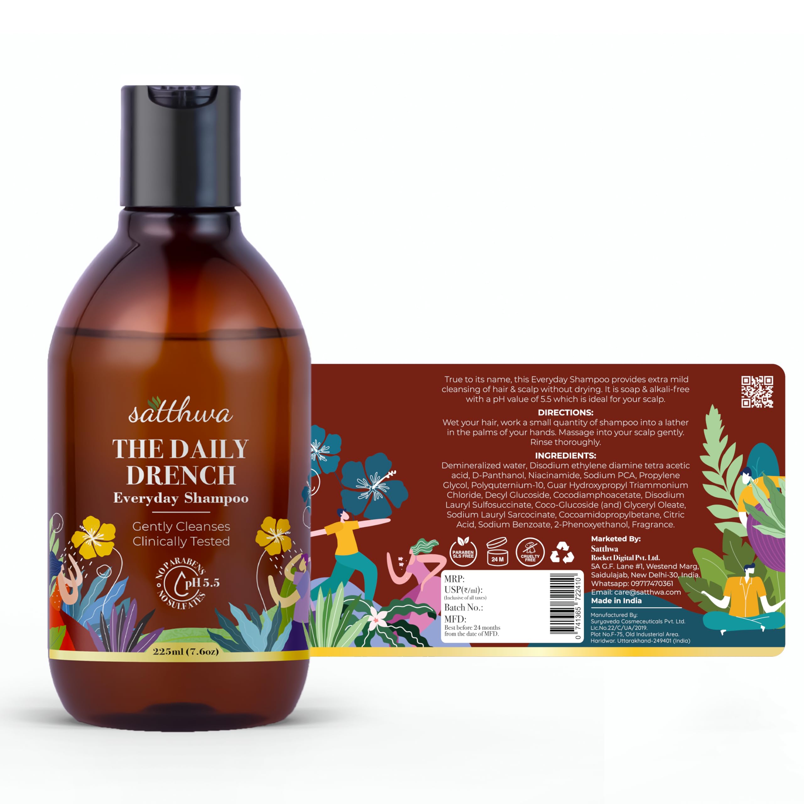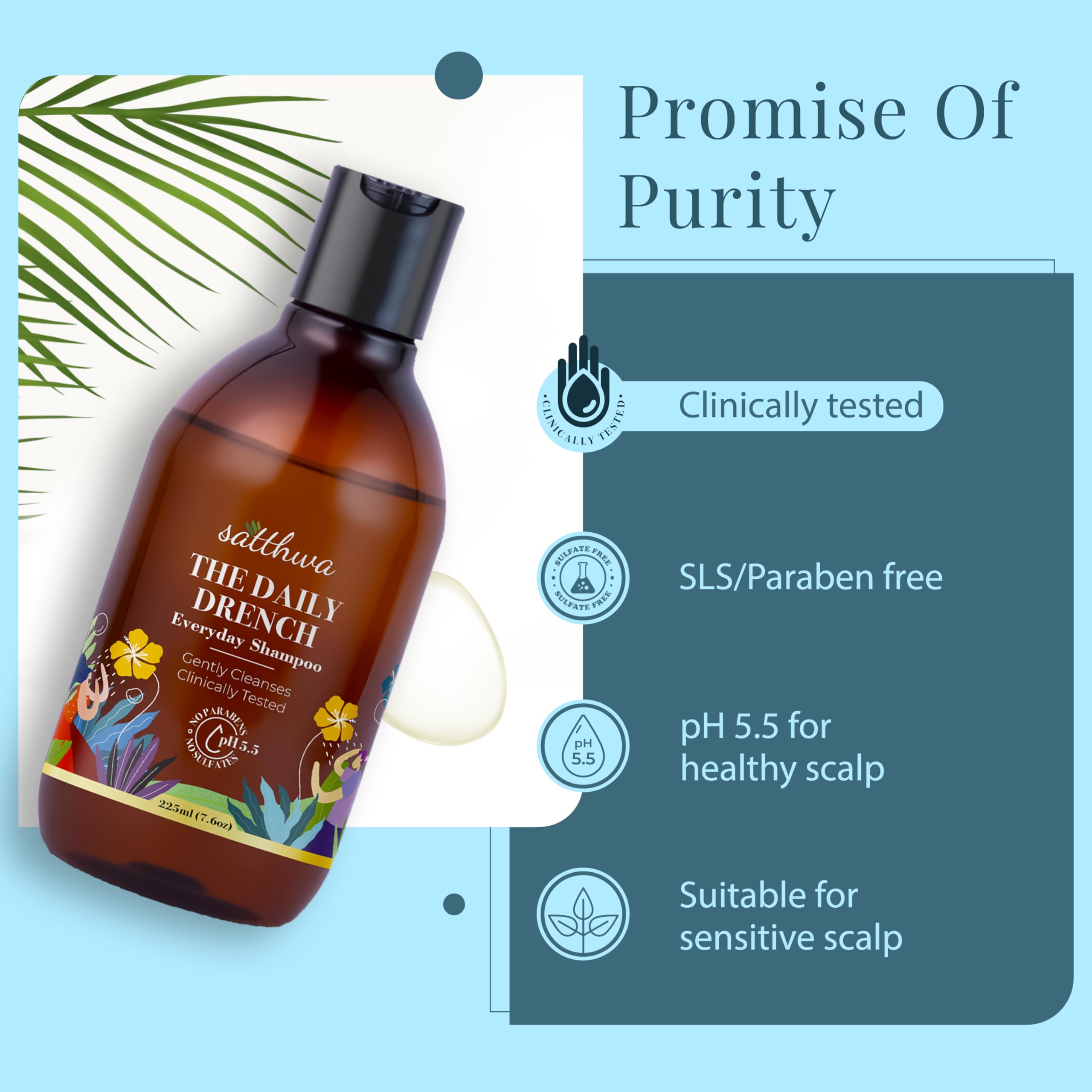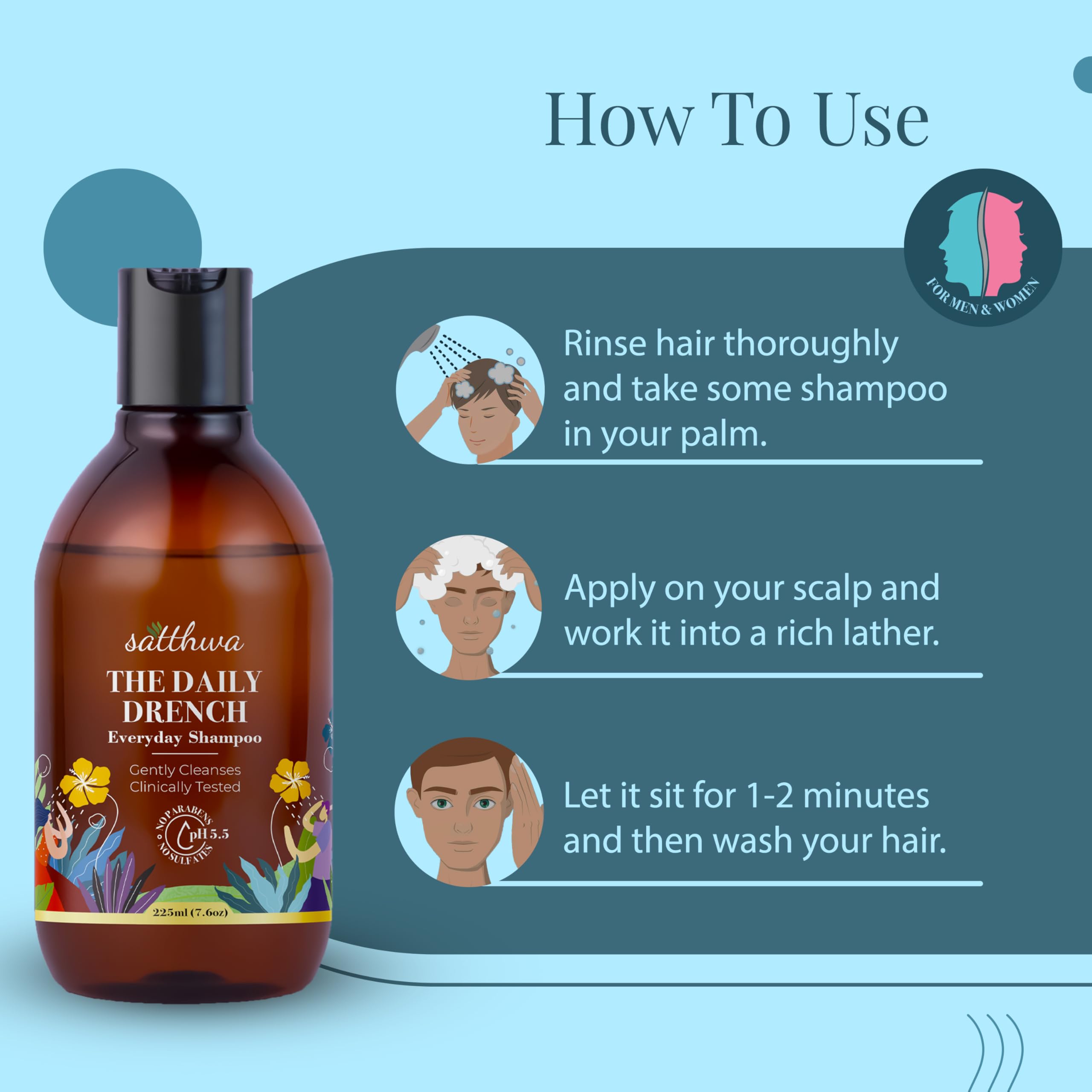 Satthwa Daily Drench - Everyday Mild Shampoo | Clinically Tested | Powered By Niacinamide | pH 5.5 | SLS & Paraben Free | All Hair Types | For Men & Women - 225ml