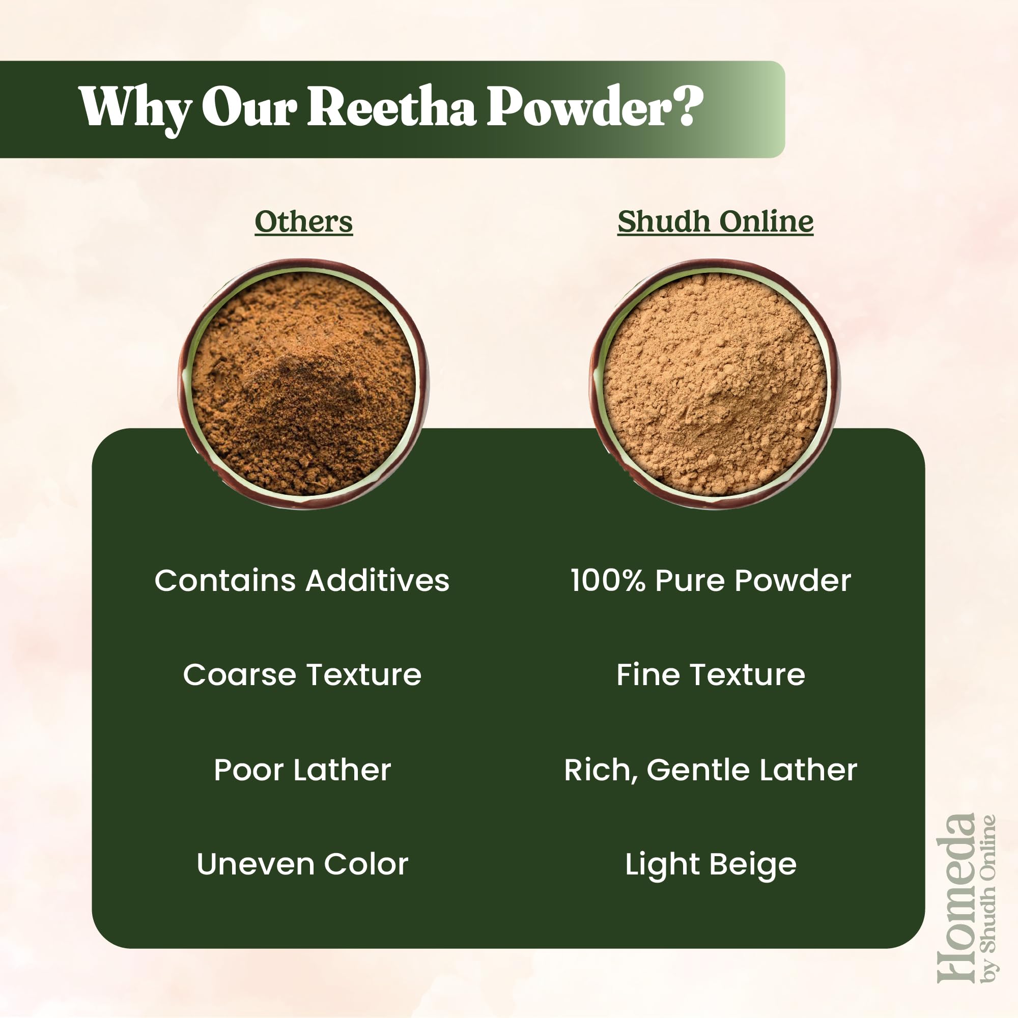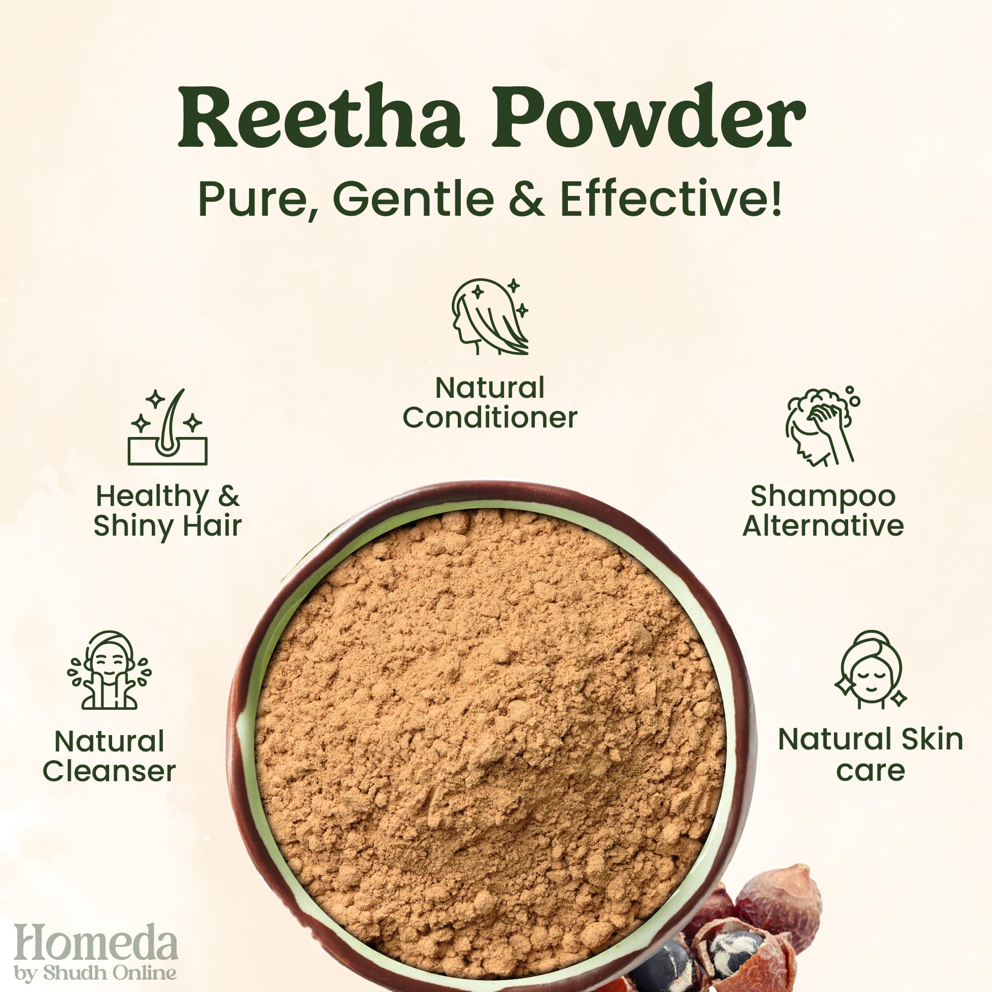 Shudh Online Organic Reetha Powder is a natural powder that provides all sorts of care required by your delicate strands of hair. Reetha extract powder has been considered the perfect companion for hair since ages and Reetha for hair is a perfect key to get great attractive hair naturally. It is also known as Kunkudukai powder for hair wash Reetha powder for hair growth Ritha powder Aritha powder. nut powder for hair Rita powder Reeta powder Kunkudukaya chettu Antuvala kayi Pannankottai Cavakkay Funaake Rakhtbeejin. Shudh Online products are selectively sourced with great emphasis on purity and authenticity and are 100% natural ayurvedic products. We don't add any or additives in the product and using our product will get you closure to nature.