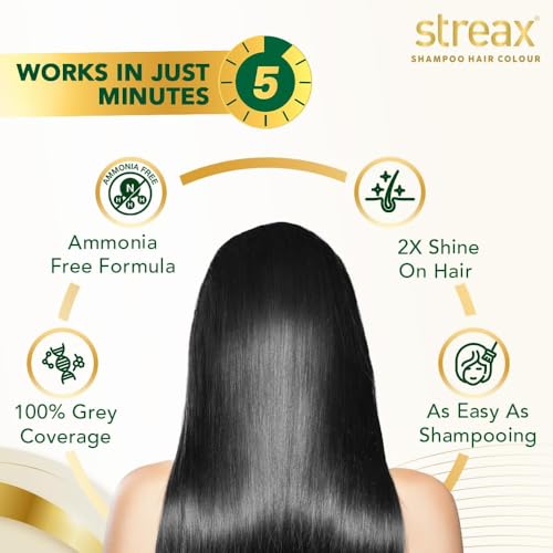 Streax Easy Do-it -Yourself Hair Colour Shampoo, 200 ml I Sqeeze Pack with Natural Extracts I Long Lasting Formula I Colours in Minutes, Natural Black