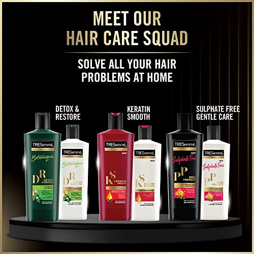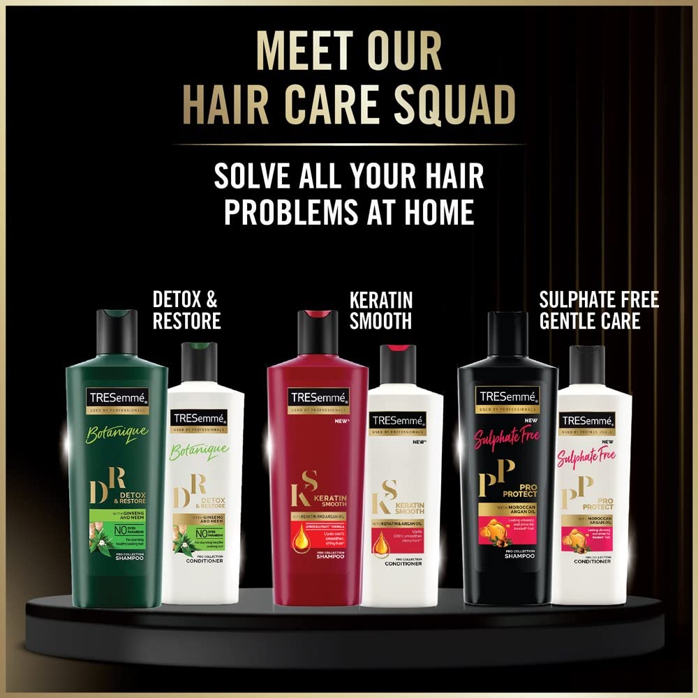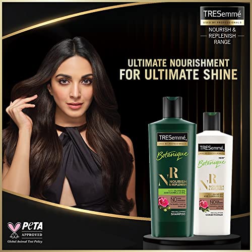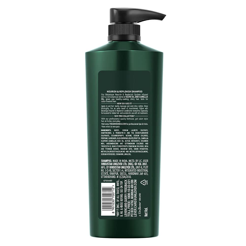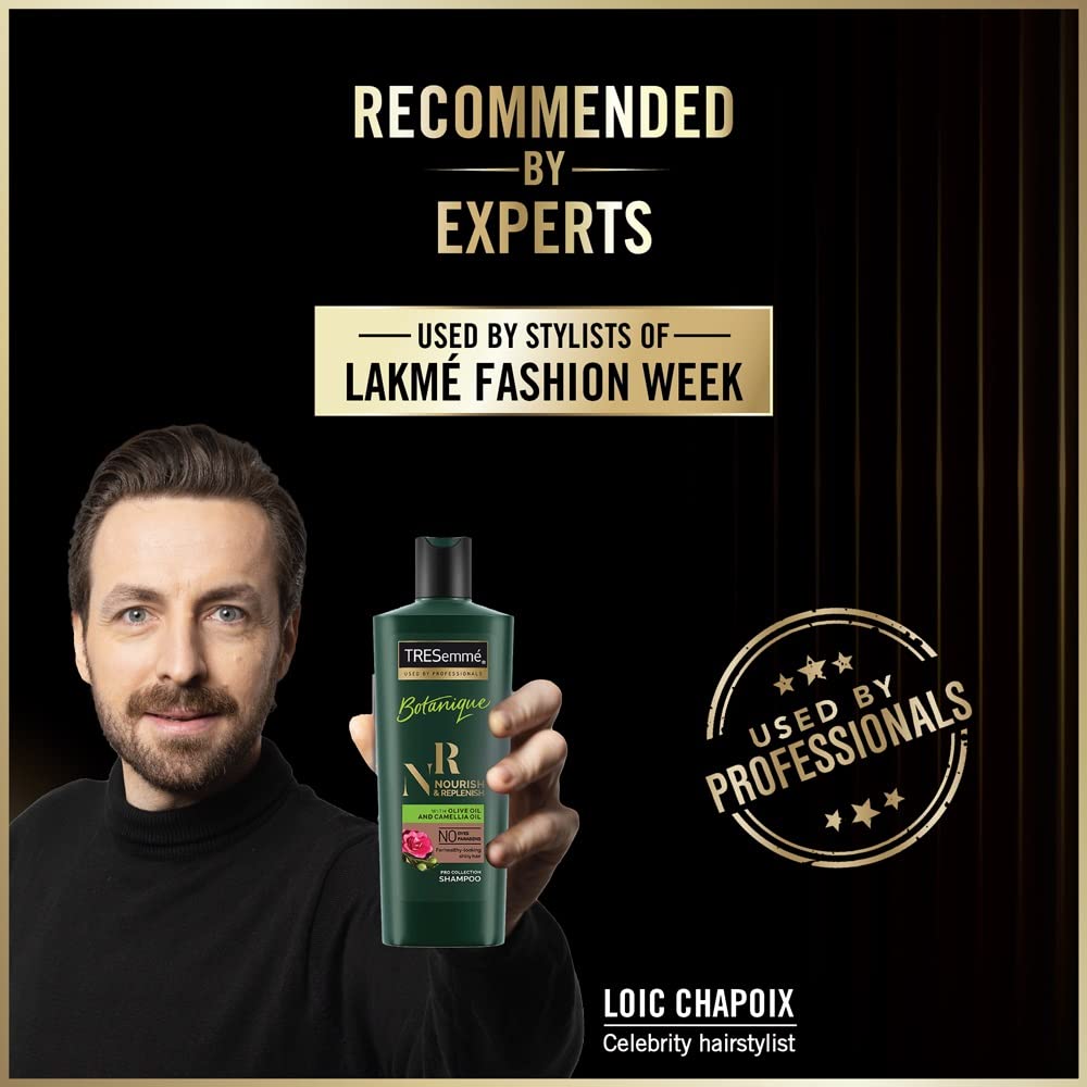 Infused with a rich botanical blend of olive oil and camellia oil|| TRESemmé Botanique Nourish & Replenish is a natural shampoo that gently cleanses and nourishes your hair. Rich in Vitamin A|| B|| C and E|| Olive oil and Camellia oil help stimulate hair growth and clean your follicles of collected dirt. They also soften your hair and help in retaining moisture. Botanique Nourish & Replenish Shampoo is equipped with patented micro-moisture technology that smoothens and protects dry hair from damage. Its expertly crafted mild system contains no parabens or dyes and is safe for color-treated hair. This nourishing shampoo can also control frizz for upto 24 hours. It deeply moisturizes your hair leaving it beautifully soft|| smooth and shiny. TRESemmé Botanique Nourish & Replenish Shampoo is especially formulated for Indian hair and is suitable for use in conjunction with oil treatments. Buy today to get softer|| smoother and healthier looking salon quality hair without the salon price tag! For best results|| use this shampoo with TRESemmé Botanique Nourish & Replenish Conditioner. Suitable for both men and women. To use: Apply to wet hair and gently massage to work into a lather. Rinse thoroughly. Follow up with the TRESemmé Botanique Nourish & Replenish Conditioner for an extra boost of nourishment. *OLD