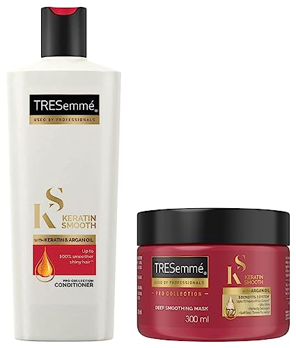 TRESemme Keratin Mask 300 mlThe product comes in safe package. The product will be an excellent pick for you.TRESemme Keratin Smooth Conditioner 335 ml With Keratin & Argan Oil for Straight Shiny Hair - Nourishes Dry Hair & Controls Frizz For Men & WomenDeep condition your hair and protect them from damage to get smoother hair with the TRESemmé Keratin Smooth Conditioner. With its lower sulfate formulation it helps restore keratin in your hair and nourishes its every strand to leave your hair straighter and shinier. Infused with Keratin and light-weight Argan oil this nourishing conditioner can make your hair visibly straight and smoother. The Keratin-Argan Oil formulation conditions and strengthens your hair as well as provides them the hydration and elasticity that they need. With its dual action TRESemmé Keratin Smooth professional conditioner can make your hair up to 100% smoother and give them extra shine. It is suitable for use for both naturally and chemically treated hair. When used together with the TRESemmé Keratin Smooth Shampoo it controls frizz for up to 3 amazing days helping you tame your frizz and giving you silky smooth hair. So say no to frizzy hair and say yes to gorgeous salon smooth hair without the salon price tag! Suitable for both men & women. To use: After shampoo apply an adequate amount of TRESemmé Keratin Smooth Conditioner from mid-lengths to the ends. Leave it on for 2-3 minutes and let it work its magic. Rinse your hair thoroughly with lukewarm water. For best results use with TRESemmé Keratin Smooth Shampoo.