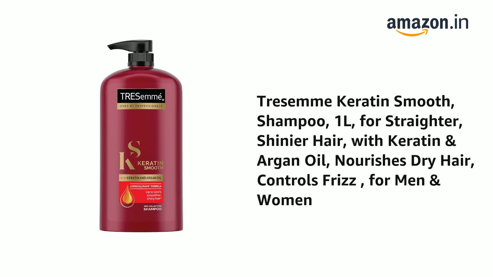 Revitalize your hair with TRESemmé Keratin Smooth Shampoo. Infused with lightweight moroccan argan oil this professional shampoo nourishes each strand of your hair making them silky smooth and easier to manage. With its dual action TRESemmé shampoo helps you get up to 100% softer hair with more shine. This no suphate shampoo formula with patented micro-moisture technology smoothens and protects dry hair from damage ensuring long-lasting results. When used together with the TRESemmé Keratin Smooth Conditioner this nourishing shampoo for women can control frizz for as long as up to 3 days. Recommended by professionals the keratin shampoo is specially formulated for Indian hair and is suitable for both naturally and chemically treated hair. It is also ideal for use in conjunction with any oil treatments. Now get visibly straighter smoother hair that is easier to style hair. Buy now to enjoy gorgeous silky hair every day without the salon price tag! Get salon-quality hair at home with TRESemmé Keratin Smooth Shampoo. To use: Apply shampoo to wet hair and gently massage to work into a lather. Rinse hair thoroughly. Follow with the TRESemmé Keratin Smooth conditioner for an extra boost of smoothness.