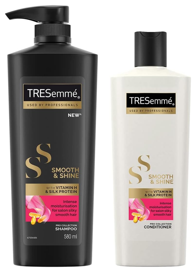 TRESemme Smooth and Shine Shampoo 580mlTRESemmé Smooth & Shine Shampoo provides intense moisturization to your hair giving you salon silky smooth hair. Enriched with Vitamin H and Silk Protein this professional shampoo has patented micro-moisture technology that protects dry hair from damage. Vitamin H which is also known as Biotin plays an important role in maintaining the health of your hair while Silk Protein helps in moisturizing hair and improving its elasticity. This salon quality shampoo has an advanced smoothing system which is enriched with Moroccan Argan oil. It is light enough for daily use. It is great for frizzy hair too. It controls frizz and flyaways without weighing your hair down to give you hair that feels detangled more manageable as well as softer and smoother. This moisturizing shampoo cleanses and helps tame unruly hair leaving your hair smooth and salon-soft. It is especially formulated for Indian hair and is suitable for use in conjunction with oil treatments. For best results use with the TRESemmé Smooth & Shine Conditioner. Buy now to make your tresses smoother shinier and easy to style! Suitable for both men and women. To use: Apply gently to wet hair and work into a lather.Rinse thoroughly. For an extra boost of shine follow with TRESemmé Smooth & Shine Conditioner.TRESemme Smooth & Shine Conditioner 340 mlTRESemmé Smooth & Shine Conditioner intensely moisturizes dry rough hair and makes them detangled manageable shiny & smooth. Infused with Vitamin H and Silk Protein this deep moisturizing conditioner can tame unruly strands and give you up to 7x smoother hair. Vitamin H which is also known as Biotin plays an important role in maintaining the health of your hair while Silk Protein helps in moisturizing hair and improving its elasticity. Its advanced smoothing system is also enriched with light-weight Moroccan Argan oil to help you get salon silky smooth hair which is beautifully soft to touch. It is also great for controlling frizz and flyaways without weighing your hair down. The TRESemmé Smooth & Shine professional conditioner is especially formulated for Indian hair and is suitable for use in conjunction with any oil treatments. Buy now to make your tresses shinier easy to style and salon like silky smooth without the salon price tag! Suitable for both men & women. To use: After shampoo apply an adequate amount of TRESemmé Smooth & Shine Conditioner from mid-lengths to the ends. Leave it on for 2-3 minutes and let it work its magic. Rinse your hair thoroughly with lukewarm water. For best results use after TRESemmé Smooth & Shine Shampoo.