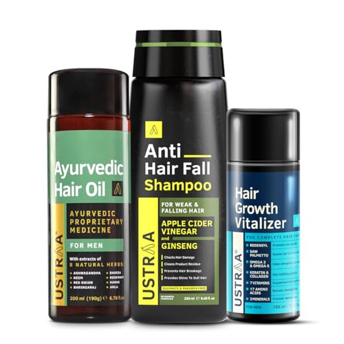 USTRAA Hair Growth Vitalizer - 100ml - Boost hair growth, Anti Hair Fall Shampoo 250ml - Clinically tested to reduce hairfall by 64% & Ayurvedic Hair Oil 200ml - with 8 Natural Herb extracts