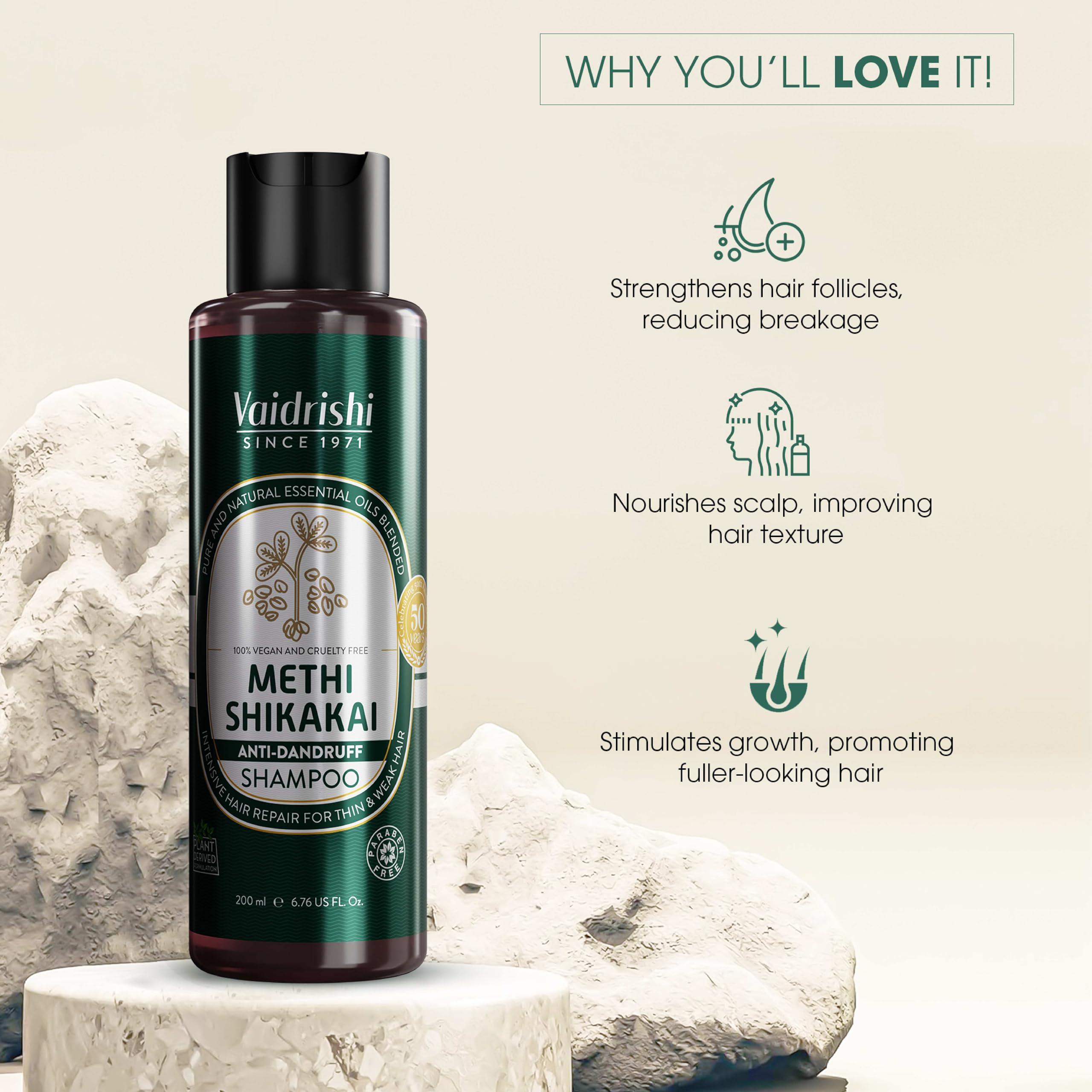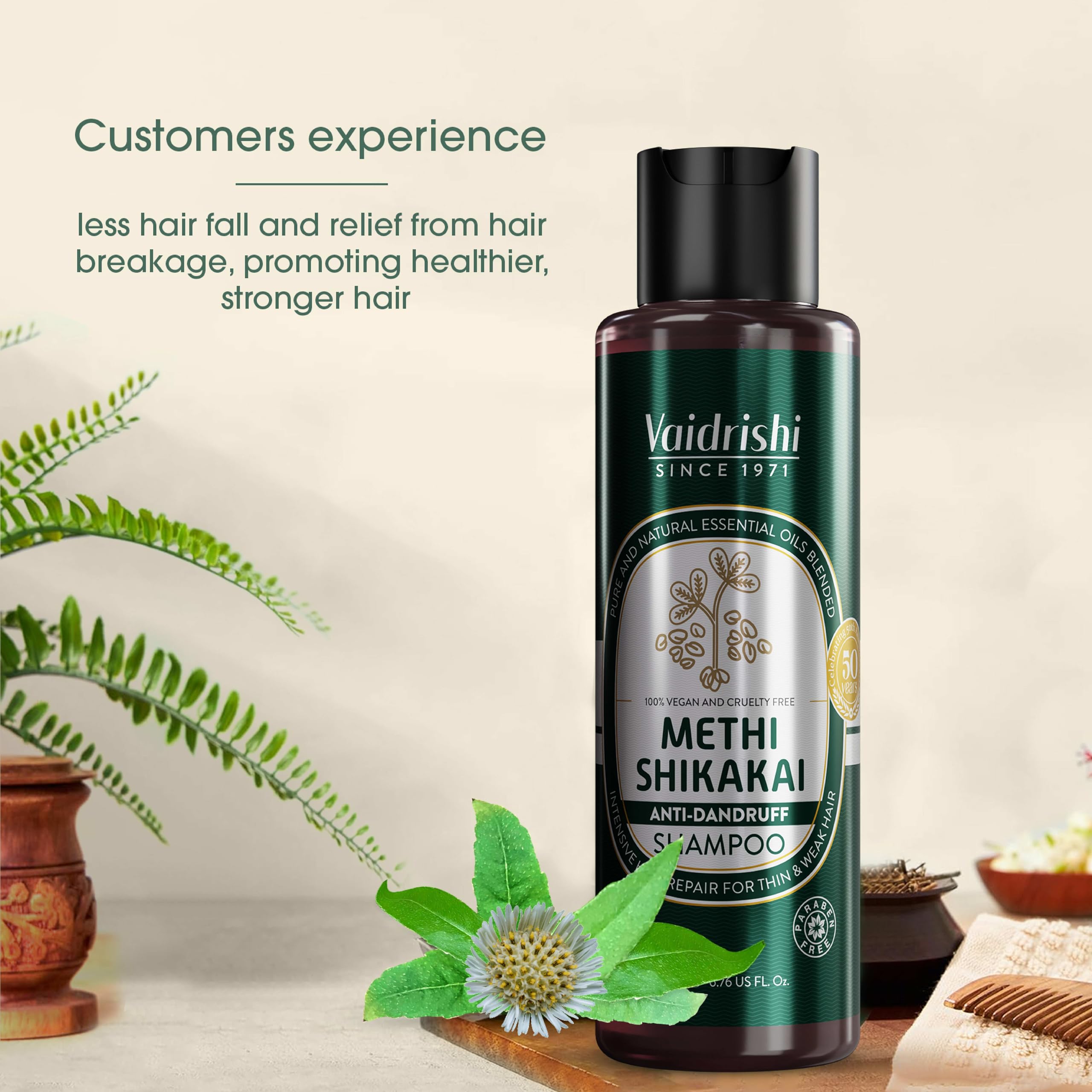 This shampoo offers a unique blend of Ayurvedic ingredients methi (fenugreek) and shikakai (acacia concinna) providing comprehensive care for the hair