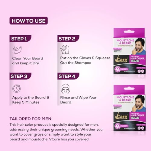 • TAILORED FOR MEN: This hair color product is specially designed for men addressing their unique grooming needs. Whether you want to cover grays or simply want to style your beard and mustache VCare has you covered.