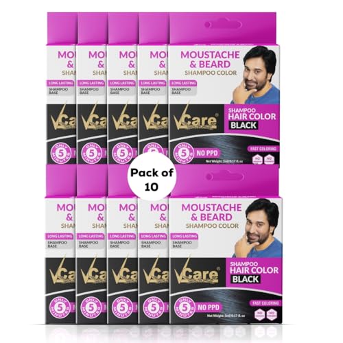 VCare Moustache and Beard color shampoo for Men Black, Natural Hair Color Dye Conditioner | No Ammonia No Paraben No PPD - 5 ml (Pack Of 10)