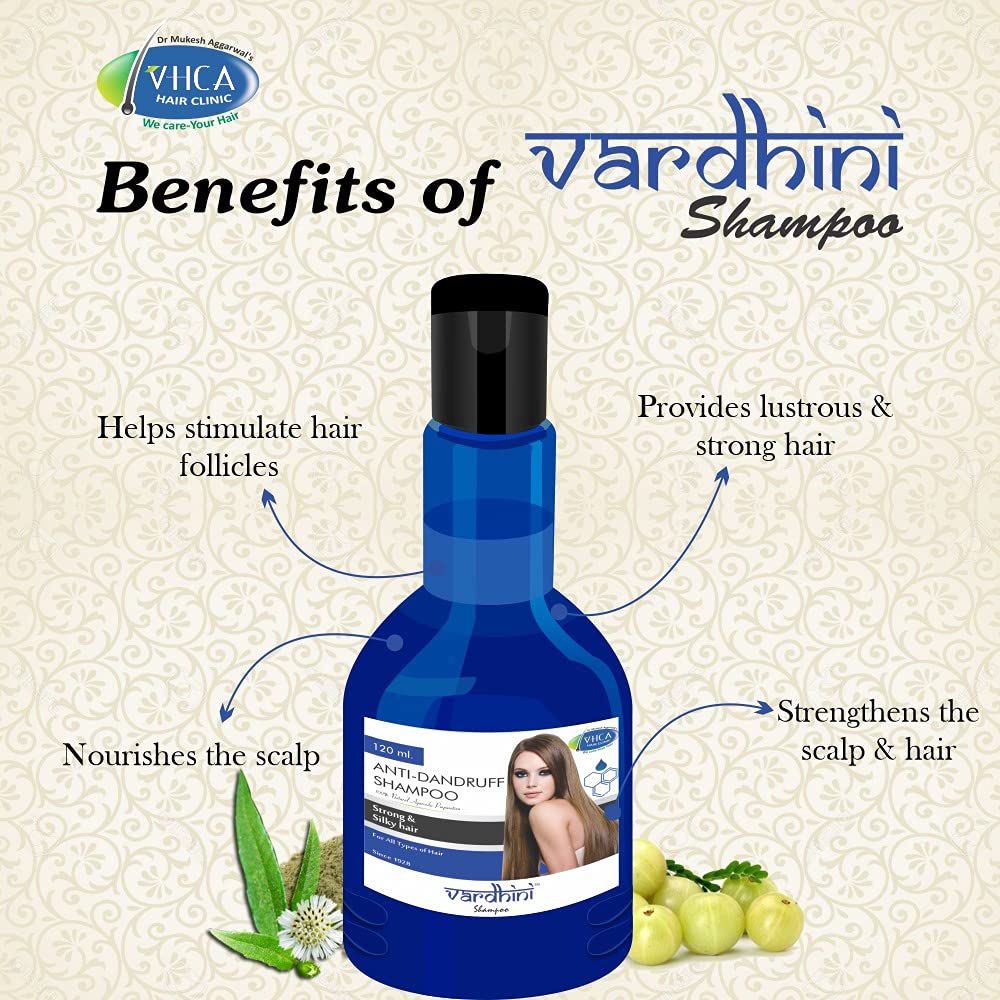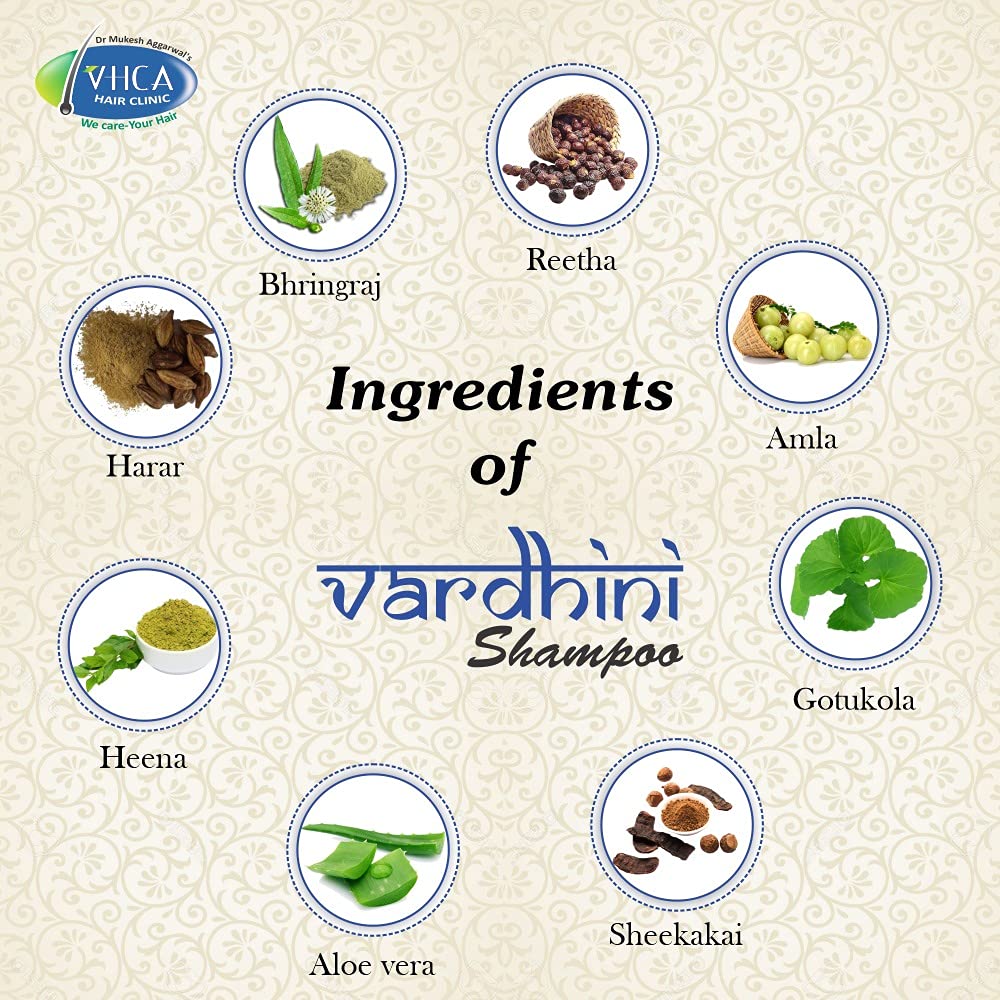 Vardhini Hair Shampoo Vardhini Hair Shampoo is a research-based product designed by VHCA Ayurveda for hair care. It contains a unique blend of herbs selected based on their proven efficacy in various clinical research studies. It is not only useful in cleansing of hairs but also effective in treating various hair and the scalp disorders. It is an herbal preparation which nourishes the hairs naturally and thus helps in checking hair fall making hairs silky and strong. It helps in maintaining routine hygiene of the scalp besides curing dandruff and seborrheic dermatitis. It contains extracts of various herbs which are helpful in the treatment of flaking scaling and itching.Directions for use: Wet hair and apply sufficient shampoo on the scalp and work into a lather. Keep shampoo on your scalp for 5 minutes before rinsing.Caution: In case of hair fall and other hair problems Vardhini Hair Shampoo is recommended to be used along with Vardhini Hair Oil and as directed by the physician.