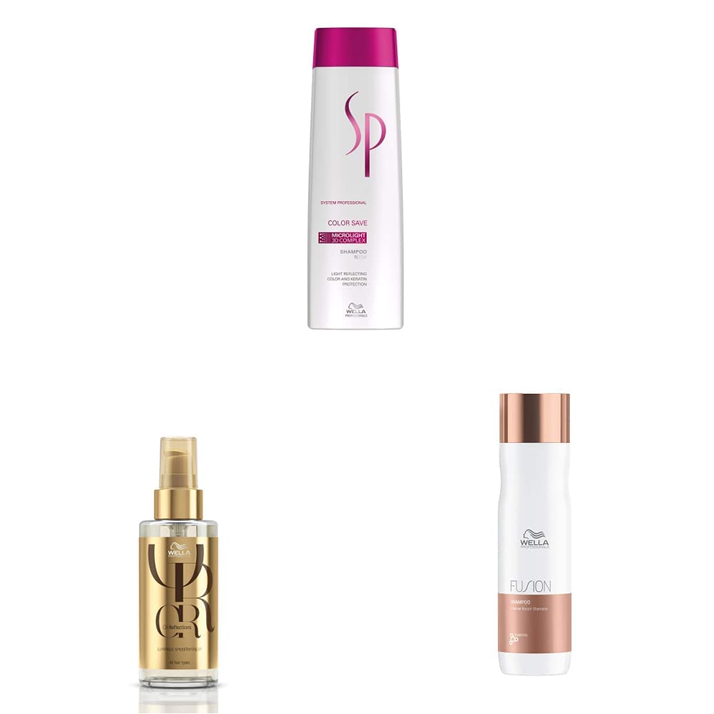 Wella Color Save Shampoo for Coloured Hair 250mlSP with its wide array of products and services has been developed to provide a highly individualized and personalized approach to hair care. We strive to deliver to you a visible long-term transformation of the hair by offering products that deliver dual hair benefits and cater to every hair type. The Color Save range is designed for colored hair. The UV filter helps in damage protection caused by UV light.Wella Professional Enrich Luminous Smoothening Treatment 100mlReveal the natural reflection of hair colour with Wella professionals oil reflections. The multi sensorial Wella hair oil can be used for conditioning styling and finishing and leaves the hair incredibly light and supple. This professional hair product enriched with macadamia seed oil avocado oil and vitamin e instantly reveals the beautiful glossy reflections of hair colour. Oil reflections is specifically designed to enhance the shine of Wella professionals colour.Wella Professionals Fusion Intense Repair Shampoo 250 mlFusion Intense Repair Shampoo gently cleanses hair and increases hair resilience against breakage. Formulated with silk amino acids this professional shampoo for damaged hair helps to repair hair and leaves it clean and cared at the same time. Wella Fusion Shampoo instantly helps to protect hair against breakage caused by combing and mechanical damage.