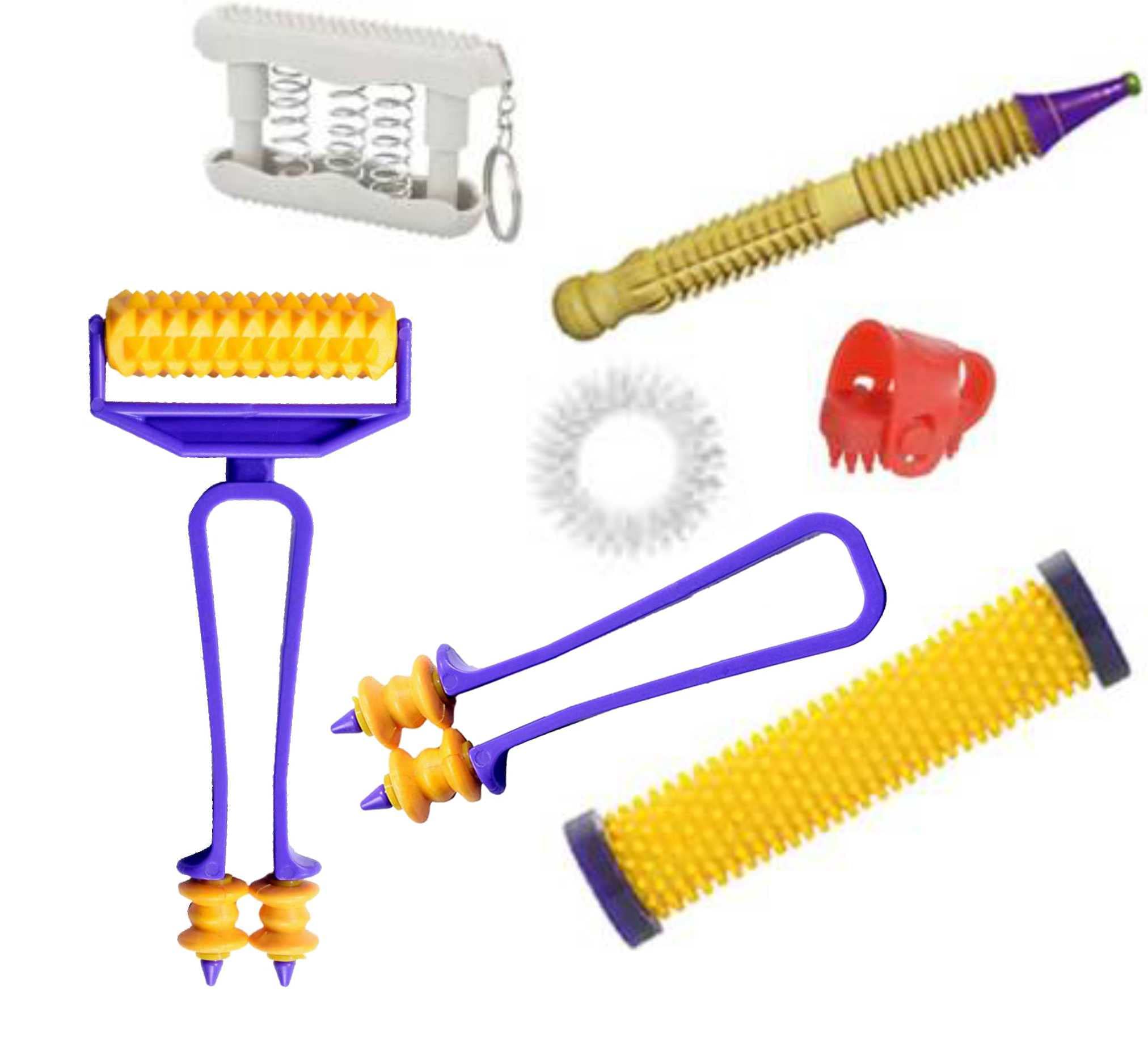 Acupressure Jimmy - Wooden - For special Su-Jok points f your finger. Use it in Su-Jok treatment. Essential tool for Su-Jok Therapist And Acupressurist. | Pocket Exerciser - It is compact effective & small equipment with tiny Acupressure points. It helps to reduce Headaches mental tension sinuses insomnia depression increase memory improves digestion and cures stomach disorders. It also strengthens your palm and forearm and makes the hand stronger. | Mini Roller (Deluxe) - Effective in joints pain. For cervical spondylitis and Total body massage and relaxation. | Hand Roll (Soft point) - Pressing all points of Hand and Finger at a time. Roll it over responsive center (hand & foot). The roller is a useful device which is used to stimulate the acupressure points located in the hands. By doing so it is said to benefit various systems in the body such as aiding blood circulation improving digestion renewed energy and pain relief. Do this for about 3-5 minutes daily before meal times for best results. | Thumb Jimmy - For pressure by Thumb. Use thumb jimmy to press the reflex point of the body. It Stimulates the blood circulation recharge the organ. A plastic multi pointed headed implement mounted on the Thumb as a crown are used for superficial stimulation of correspondence areas located on flat & rough surfaces like areas corresponding to our abdomen organs on the palm inner & rear side.