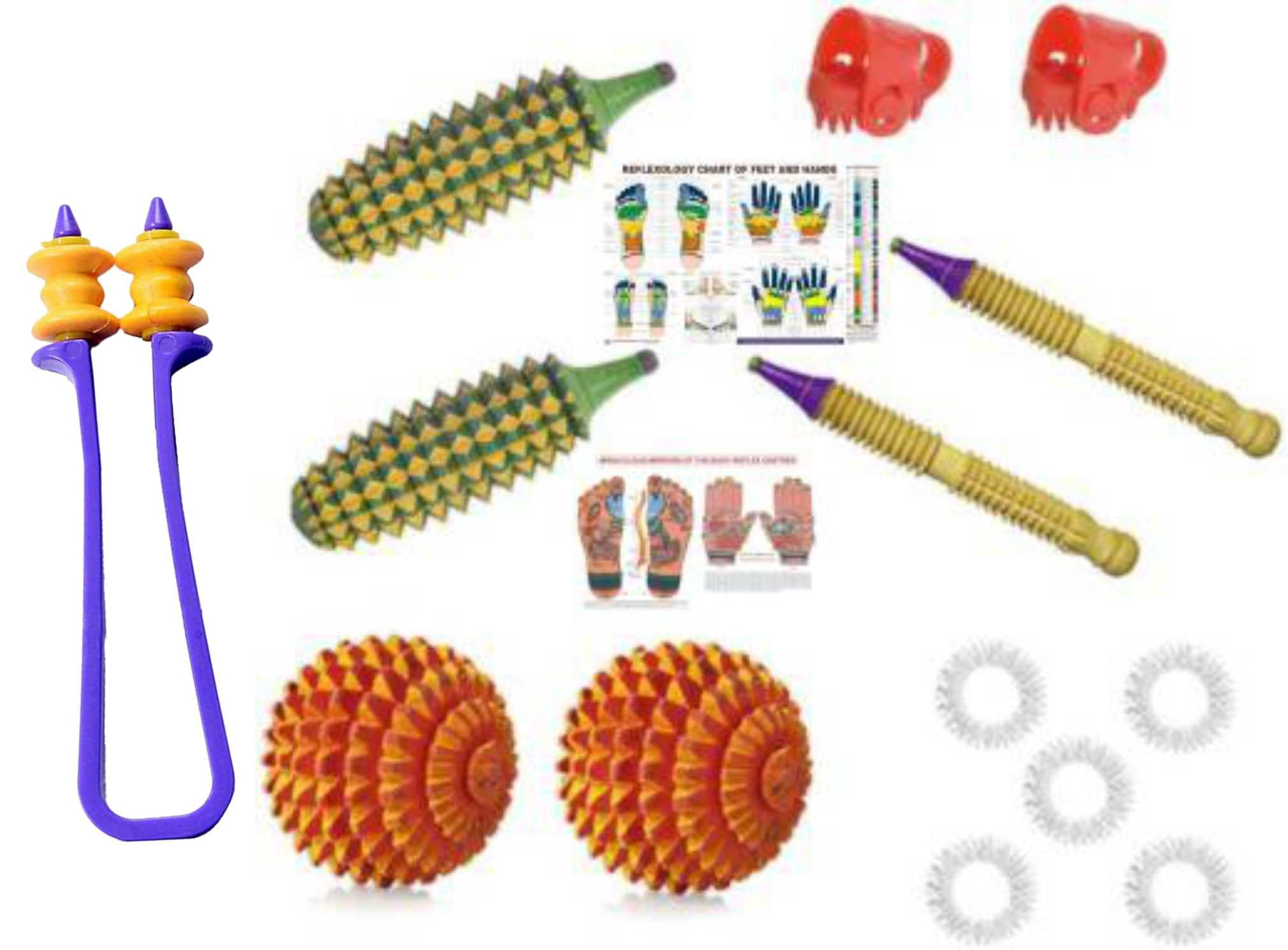Acupressure Jimmy - Wooden - For special Su-Jok points f your finger. Use it in Su-Jok treatment. Essential tool for Su-Jok Therapist And Acupressurist. | Thumb Jimmy - For pressure by Thumb. Use thumb jimmy to press the reflex point of the body. It Stimulates the blood circulation recharge the organ. A plastic multi pointed headed implement mounted on the Thumb as a crown are used for superficial stimulation of correspondence areas located on flat & rough surfaces like areas corresponding to our abdomen organs on the palm inner & rear side. | Karela Roll (Wooden) - For special point of your Hands. Roll in your hands 5 to 10 minutes daily. Stimulates Acupressure points activates blood circulation tiredness freshness & total health. It is made up of standard wood. It is known as wooden karela. | Energy Ball (Wooden) - For special points of your Hands Foot and Body. Roll in your hands for 5 to 10 minutes daily. Best for middle part of palm & finger relaxation. Stimulates acupressure points activates blood circulation tiredness freshness effective in shoulder pain & total health. This is in pyramidal ball shape. hence it is known as energy-ball. | Sujok Ring (Silver) - For pressure of your Fingers Points. Use: Roll it in finger with mild pressure. Designed for thorough stimulation of the finger toes. Regular application enhances your blood circulation & promotes effectiveness on the organ at large.