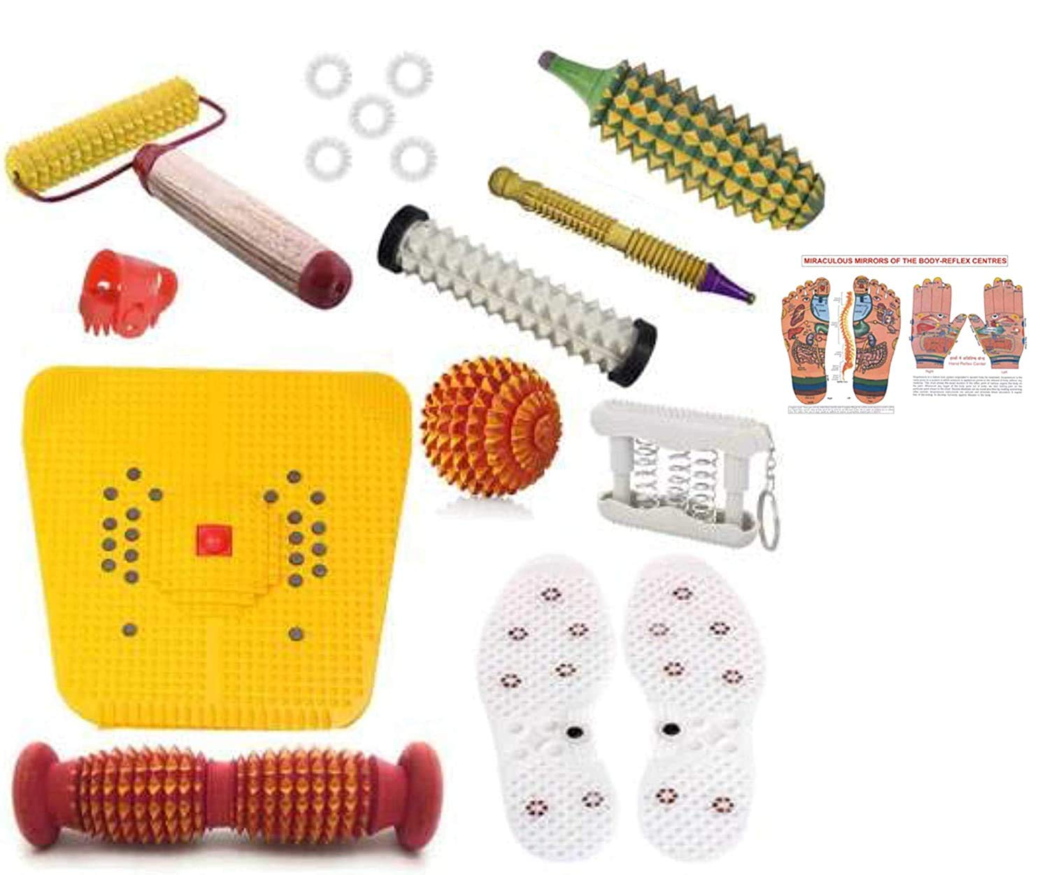 Power Mat - TOP - SELLING PAIN RELIEVER: It is a new computerized design with energy centre pyramid yantra orbit and innovative new foot shape design to cover all important pressure points. Warm up your Body by jogging for three to five minutes daily. Morning freshness with total health. Also gives relief in sciatica leg pain cramps heel pain knee pain piles migraine sinus insomnia constipation gastric acidity diabetes indigestion & renal problems | Sujok Ring (Silver) - For pressure of your Fingers Points. Use: Roll it in finger with mild pressure. Designed for thorough stimulation of the finger toes. Regular application enhances your blood circulation & promotes effectiveness on the organ at large. | Energy Ball (Wooden) - For special points of your Hands Foot and Body. Roll in your hands for 5 to 10 minutes daily. Best for middle part of palm & finger relaxation. Stimulates acupressure points activates blood circulation tiredness freshness effective in shoulder pain & total health. This is in pyramidal ball shape. hence it is known as energy-ball. | Acupressure Jimmy - Wooden - For special Su-Jok points f your finger. Use it in Su-Jok treatment. Essential tool for Su-Jok Therapist And Acupressurist. | Karela Roll (Wooden) - For special point of your Hands. Roll in your hands 5 to 10 minutes daily. Stimulates Acupressure points activates blood circulation tiredness freshness & total health. It is made up of standard wood. It is known as wooden karela. | Hand Roll (Soft point) - Pressing all points of Hand and Finger at a time. Roll it over responsive center (hand & foot). The roller is a useful device which is used to stimulate the acupressure points located in the hands. By doing so it is said to benefit various systems in the body such as aiding blood circulation improving digestion renewed energy and pain relief. Do this for about 3-5 minutes daily before meal times for best results. | Shoe Sole - Wonder Height increaser that helps you