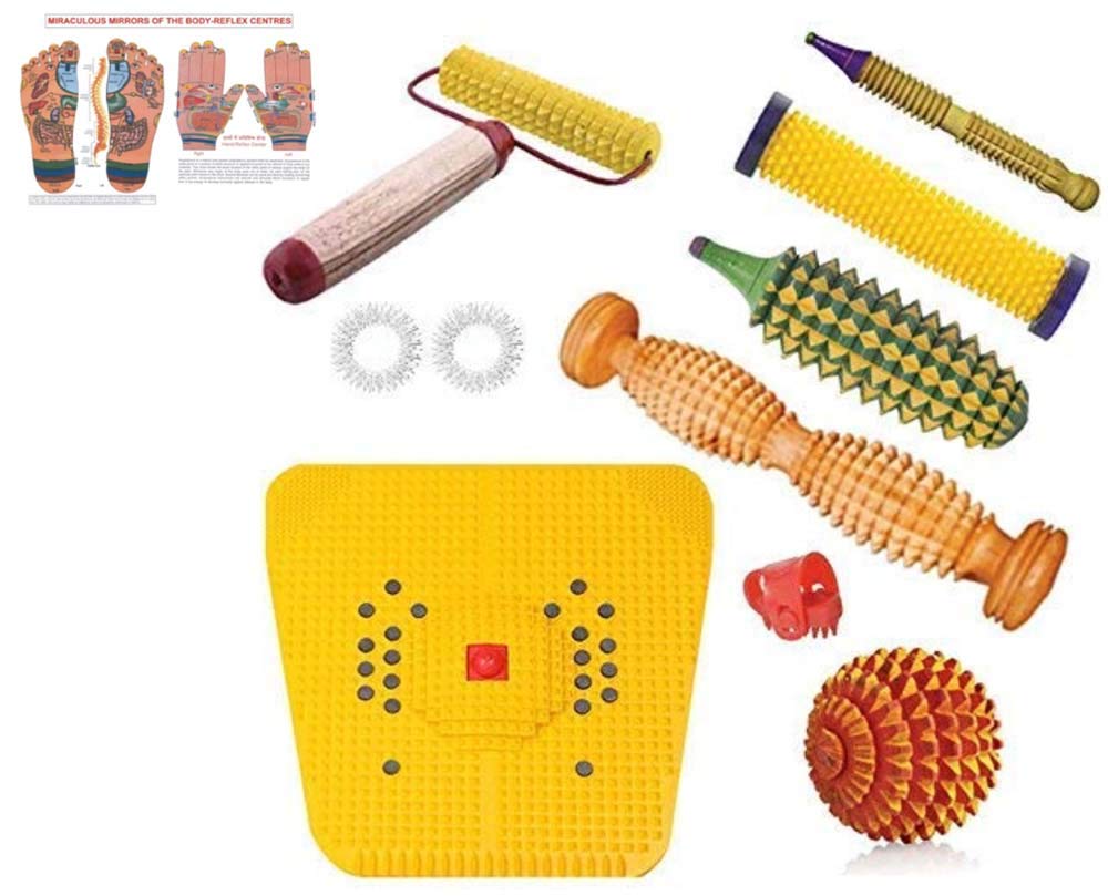 Power Mat - TOP - SELLING PAIN RELIEVER: It is a new computerized design with energy centre pyramid yantra orbit and innovative new foot shape design to cover all important pressure points. Warm up your Body by jogging for three to five minutes daily. Morning freshness with total health. Also gives relief in sciatica leg pain cramps heel pain knee pain piles migraine sinus insomnia constipation gastric acidity diabetes indigestion & renal problems | Sujok Ring (Silver) - For pressure of your Fingers Points. Use: Roll it in finger with mild pressure. Designed for thorough stimulation of the finger toes. Regular application enhances your blood circulation & promotes effectiveness on the organ at large. | Energy Ball (Wooden) - For special points of your Hands Foot and Body. Roll in your hands for 5 to 10 minutes daily. Best for middle part of palm & finger relaxation. Stimulates acupressure points activates blood circulation tiredness freshness effective in shoulder pain & total health. This is in pyramidal ball shape. hence it is known as energy-ball. | Acupressure Jimmy - Wooden - For special Su-Jok points f your finger. Use it in Su-Jok treatment. Essential tool for Su-Jok Therapist And Acupressurist. | Karela Roll (Wooden) - For special point of your Hands. Roll in your hands 5 to 10 minutes daily. Stimulates Acupressure points activates blood circulation tiredness freshness & total health. It is made up of standard wood. It is known as wooden karela. | Hand Roll (Soft point) - Pressing all points of Hand and Finger at a time. Roll it over responsive center (hand & foot). The roller is a useful device which is used to stimulate the acupressure points located in the hands. By doing so it is said to benefit various systems in the body such as aiding blood circulation improving digestion renewed energy and pain relief. Do this for about 3-5 minutes daily before meal times for best results. | Shoe Sole - Wonder Height increaser that helps you