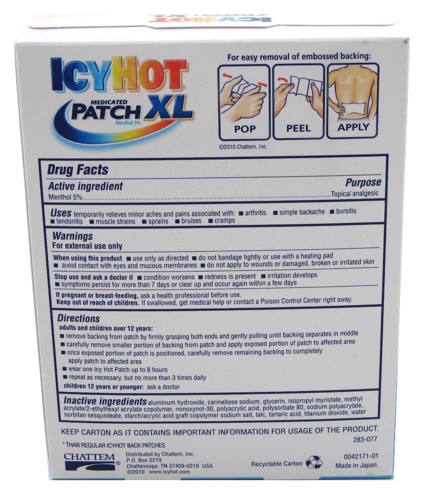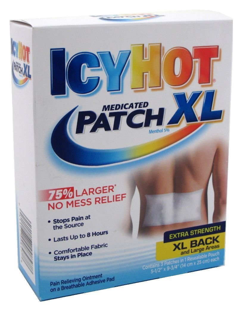 DetailsTemporarily relieves minor pain associated with: arthritis simple backache bursitis tendonitis muscle strains bruises muscle sprains cramps.5-1/2 x 9-3/4" patchDirectionsAdults and children over 12 years: remove backing from patch by grasping both ends firmly and gently pulling until backing separates. Carefully remove smaller portion of backing from patch and apply exposed portion of patch to affected area. Once exposed portion of patch is positioned carefully remove remaining backing to completely apply patch to affected area.Apply one patch to affected area. wear one Icy Hot Patch up to 8 hours. Repeat as necessary but no more than 4 times daily. Children 12 years or younger: ask a doctor.WARNINGS:For external use only. When using this product use only as directed. Do not bandage tightly or use with a heating pad. Avoid contact with eyes and mucous membranes. Do not apply to wounds or damaged skin. Stop use and ask a doctor if condition worsens redness is present irritation develops symptoms persist for more than 7 days or clear up and occur again within a few days. If pregnant or breast-feeding ask a health professional before use. Keep out of reach of children. If swallowed get medical help or contact a Poison Control Center right away. Keep carton as it contains important information for usage of the product."MEDICATED XL BACK PATCH EXTRA STRENGTH