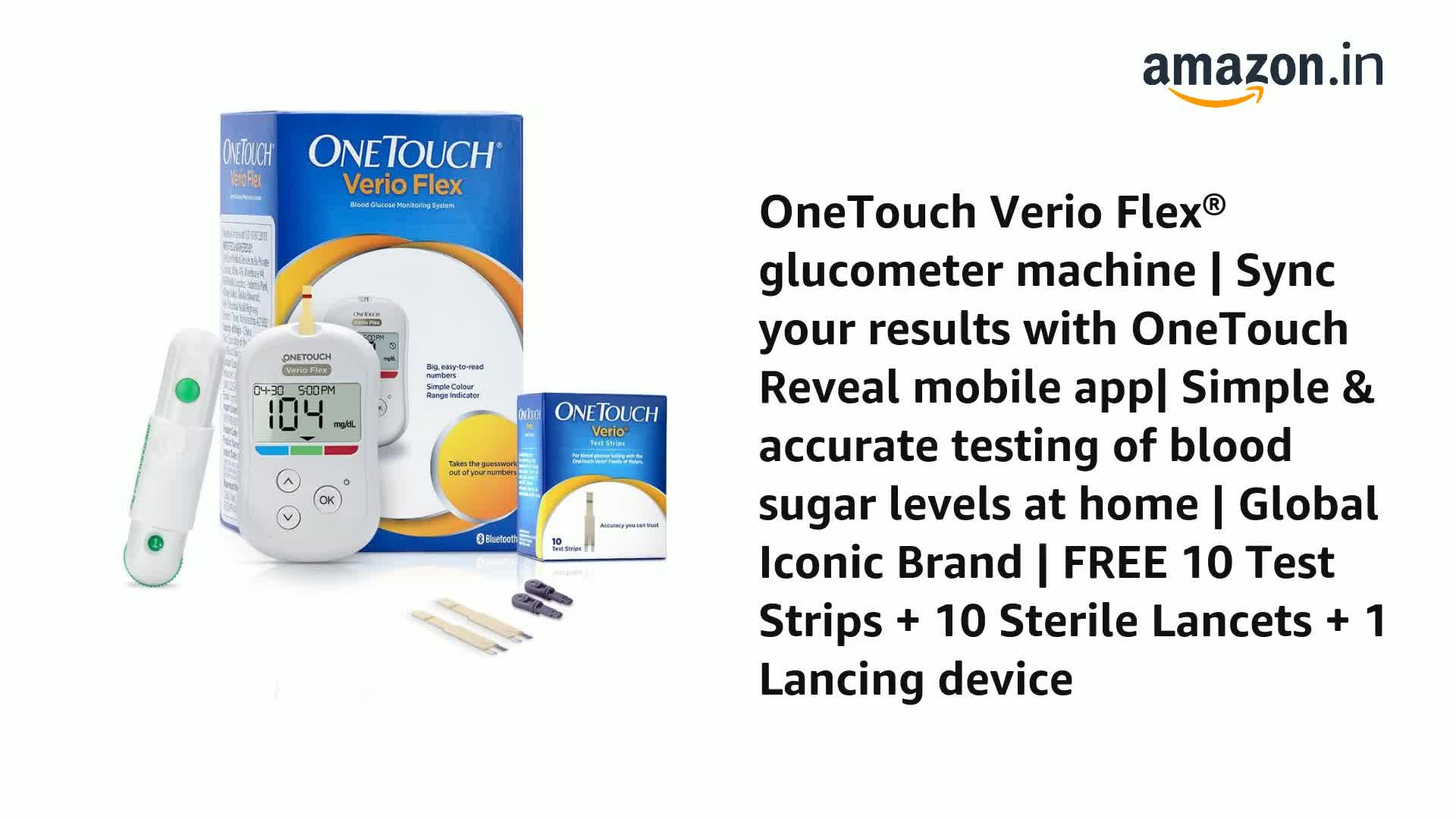 OneTouch Verio Flex glucometer machine | Sync your results with OneTouch Reveal mobile app| Simple & accurate testing of blood sugar levels at home | Global Iconic Brand | FREE 10 Test Strips + 10 Sterile Lancets + 1 Lancing device