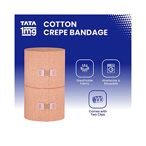 Tata 1mg cotton crepe bandage which relieves muscle strain and joint pain reduces swelling and provides warmth and firm support to the affected area. These bandages come in 3 sizes: S (6 cm) M (8 cm) and L (10 cm) with fastening clips. It is made from super-soft skin-friendly and absorbent material. Tata 1mg Cotton Crepe Bandage is suitable for use as support for sprains and strains in joints and muscles. It works as a moderate compression bandage for knee swelling ankle swelling and other relevant injuries. Uses: It relieves muscle strain and joint pain. It helps reduce swelling. It provides warmth and firm support to the affected area. Product Specifications and Features: It is super soft and comfortable to wear it is made from a skin-friendly and absorbent material and it offers firm support and compression to the affected area.