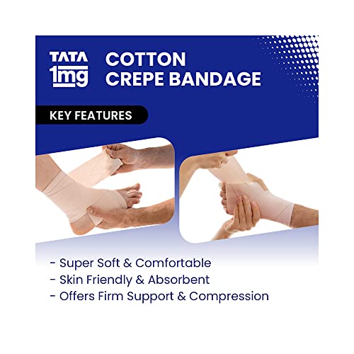 Tata 1mg cotton crepe bandage which relieves muscle strain and joint pain reduces swelling and provides warmth and firm support to the affected area. These bandages come in 3 sizes: S (6 cm) M (8 cm) and L (10 cm) with fastening clips. It is made from super-soft skin-friendly and absorbent material. Tata 1mg Cotton Crepe Bandage is suitable for use as support for sprains and strains in joints and muscles. It works as a moderate compression bandage for knee swelling ankle swelling and other relevant injuries. Uses: It relieves muscle strain and joint pain. It helps reduce swelling. It provides warmth and firm support to the affected area. Product Specifications and Features: It is super soft and comfortable to wear it is made from a skin-friendly and absorbent material and it offers firm support and compression to the affected area.