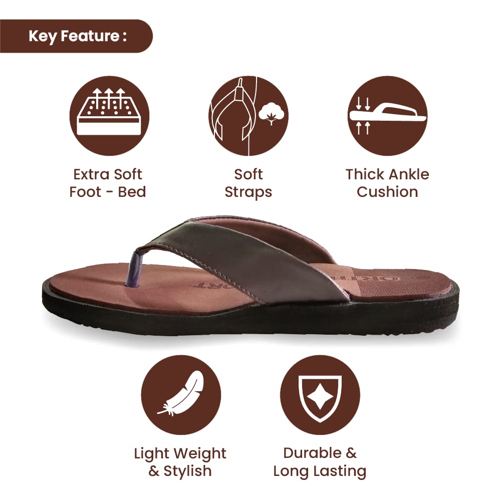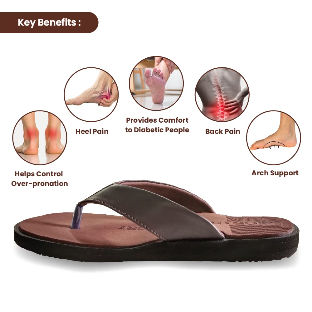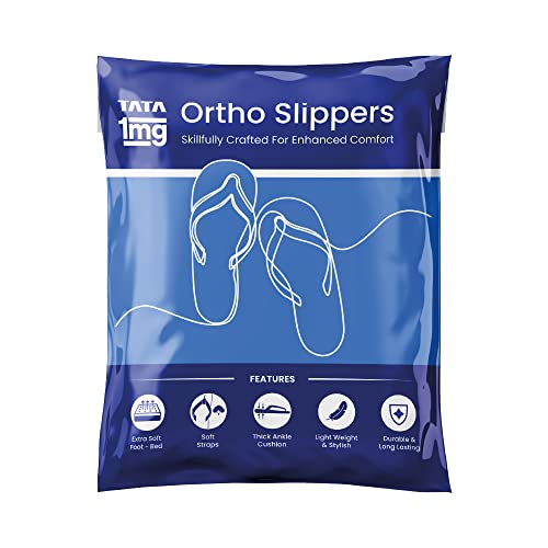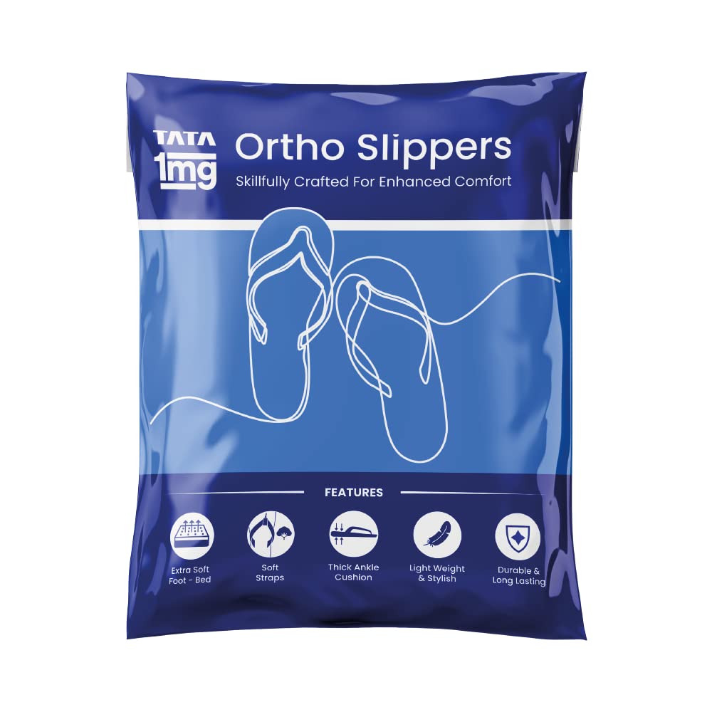 Tata 1MG Ortho Slippers for Men are made with soft eva and micro polymer insole material and skillfully designed to provide comfort to people suffering from diabetes and people with orthopedic health issues such as plantar fasciitis ortho pain heel pain knee pain or back pain. These slippers are with extra soft footbeds give a pain-free experience while walking and help control over-pronation providing relief from aching feet. Its broad front footbed is ideal for wide feet. Uses: Provides comfort and relief to people suffering from diabetes and people with orthopedic health issues while walking. It reduces and relieves from heel pain knee pain or back pain. Product Specifications and Features: Tata 1mg ortho slippers are made with soft eva and micro polymer insole material. Skillfully designed to provide comfort to people suffering from diabetes and people with orthopedic health issues. These ortho slippers with extra soft footbed give a pain-free experience while walking. Ortho slippers are preventive footwear and help control over-pronation providing relief to aching feet. Its broad front footbed is ideal for wide feet. Available sizes for Women: 89 & 10. Colour: Brown . Directions For Use: Use it like a regular pair of slippers.