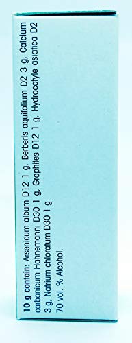 INDICATIONS Psoriasis vulgaris, psoriasis-like eczema. MODE OF ACTION OF MAIN INGREDIENTS: All the chosen constitutional remedies have a particular affinity for the skin.Arsenicum Alb: Psoriasis vulgarisBerberis aquifolium: Has proven itself in psoriasis.Calcium carbonicum Hahnemanni: Scrofulous diathesis, fair, fat, flabby type of patient, impaired nutrition.Graphites: Stout, fair patients. Rough, hard and persistent dryness of areas of skin. Eruptions ooze a sticky exudate.Hydrocotyle asiatica: Great thickening of epidermoid layer with exfoliation of scales. Circular spots with scaly edges.Natrium chloratum: Flabby, debilitated constitution, tending to hyperthyroidism. Seborrhoeiac eczema. DOSAGE - 10-15 drops in water, 2 to 3 times daily before meals. Period variable depending on the case