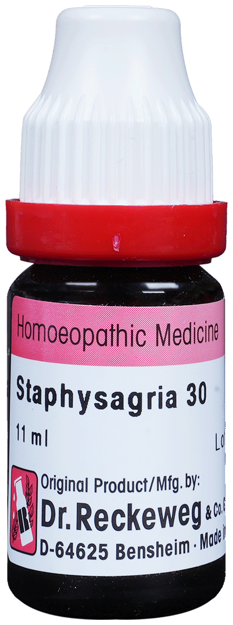 Dr. Reckeweg Staphysagria Dilution is a homoeopathic remedy crafted from the Staphysagria plant, known for its therapeutic properties. This potent dilution undergoes a meticulous preparation process in line with homoeopathic principles to ensure its efficacy. It is primarily indicated for conditions related to emotional stress, suppressed anger, and physical manifestations arising from such emotional disturbances. It is helpful in children's teeth problems and colicky pain. It is an effective solution for headache and many types of scalp problems including hair fall, dandruff and eczema. The dilution is formulated to address various symptoms across physical and mental domains, providing holistic relief to individuals seeking natural remedies for their health concerns.