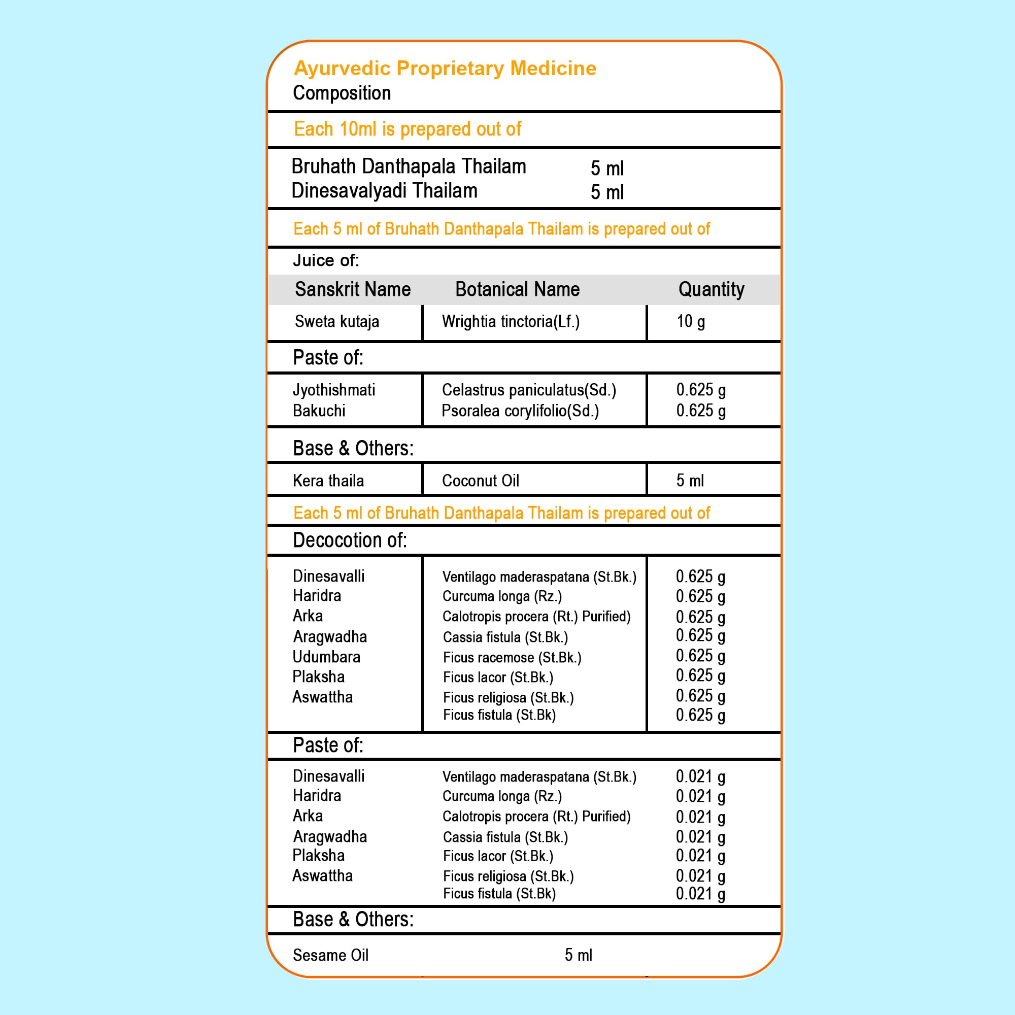 • The powerful combination of Bruhath Danthapala and Dinesavalyadi thailams helps reduce the visible symptoms such as scaling and flaking of the skin while also soothing itchiness and irritation.