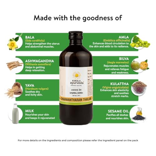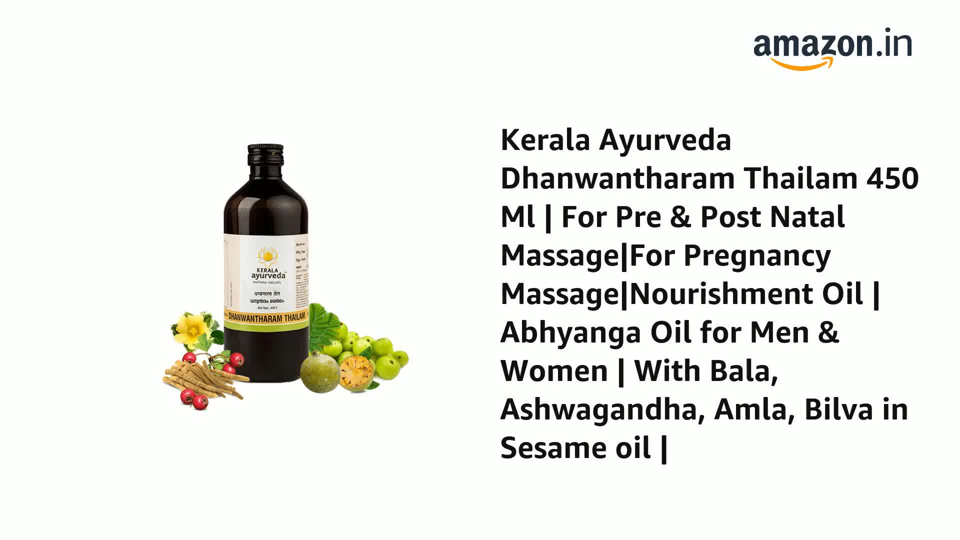 • Quantity: 450 ml; Item Form: Thailam; Massage oil for new mothers- Dhanwantharam Thailam is a nourishing and relaxing Abhyanga or massage oil that helps ease the stress during prenatal and postnatal period in women.