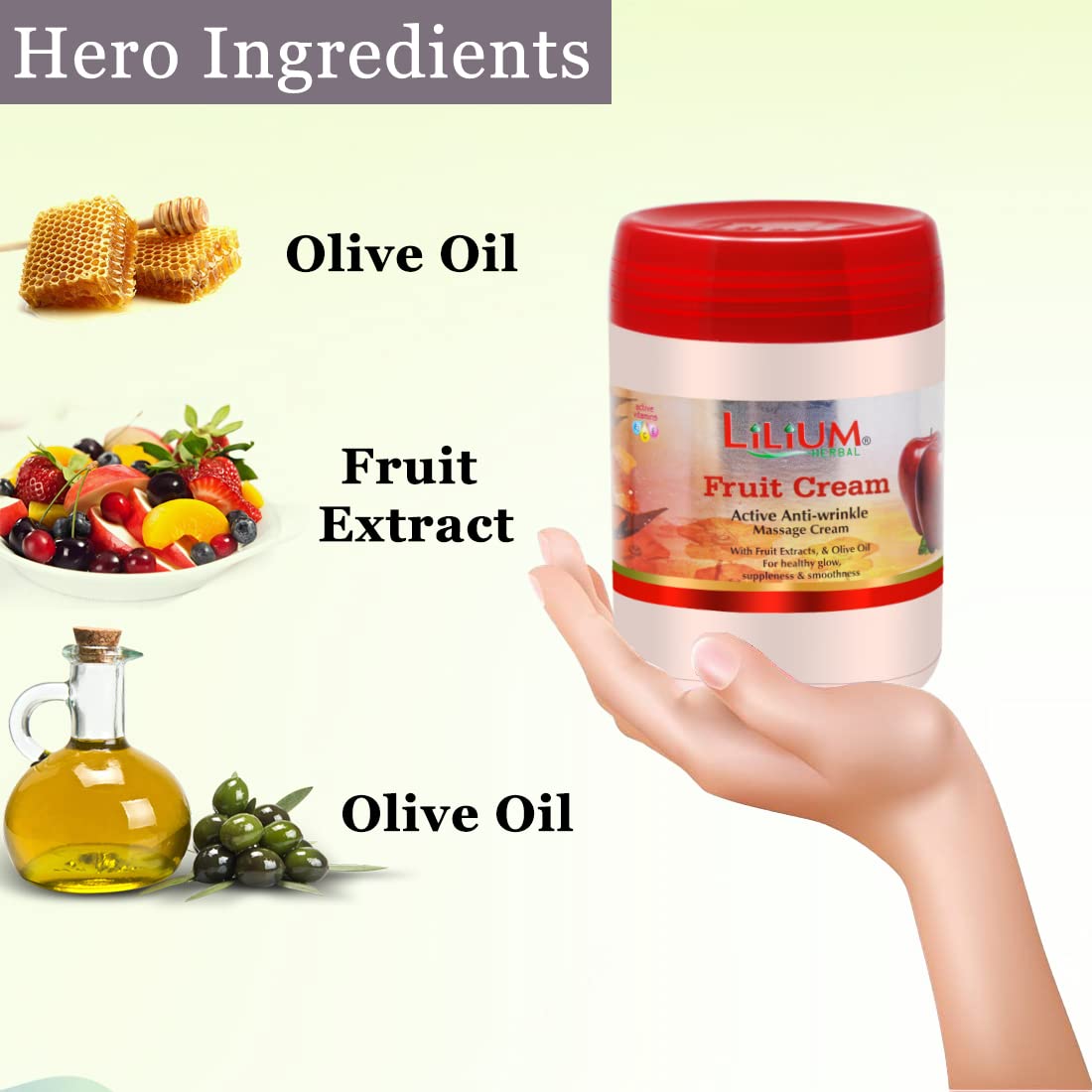 Fruit Massage Cream A unique blend of aroma oil natural herbs and fruit extract containing fruit which protects the skin from environmental damage and dryness It is enriched with apple orange papaya & kokum butter which reduces skin wrinkling makes skin soft & supple and removes dark patches. It improves skin complexion makes skin glowing and more bright maintains the natural elasticity of the skin promotes blood circulation to keep the skin healthy and natural fruit.