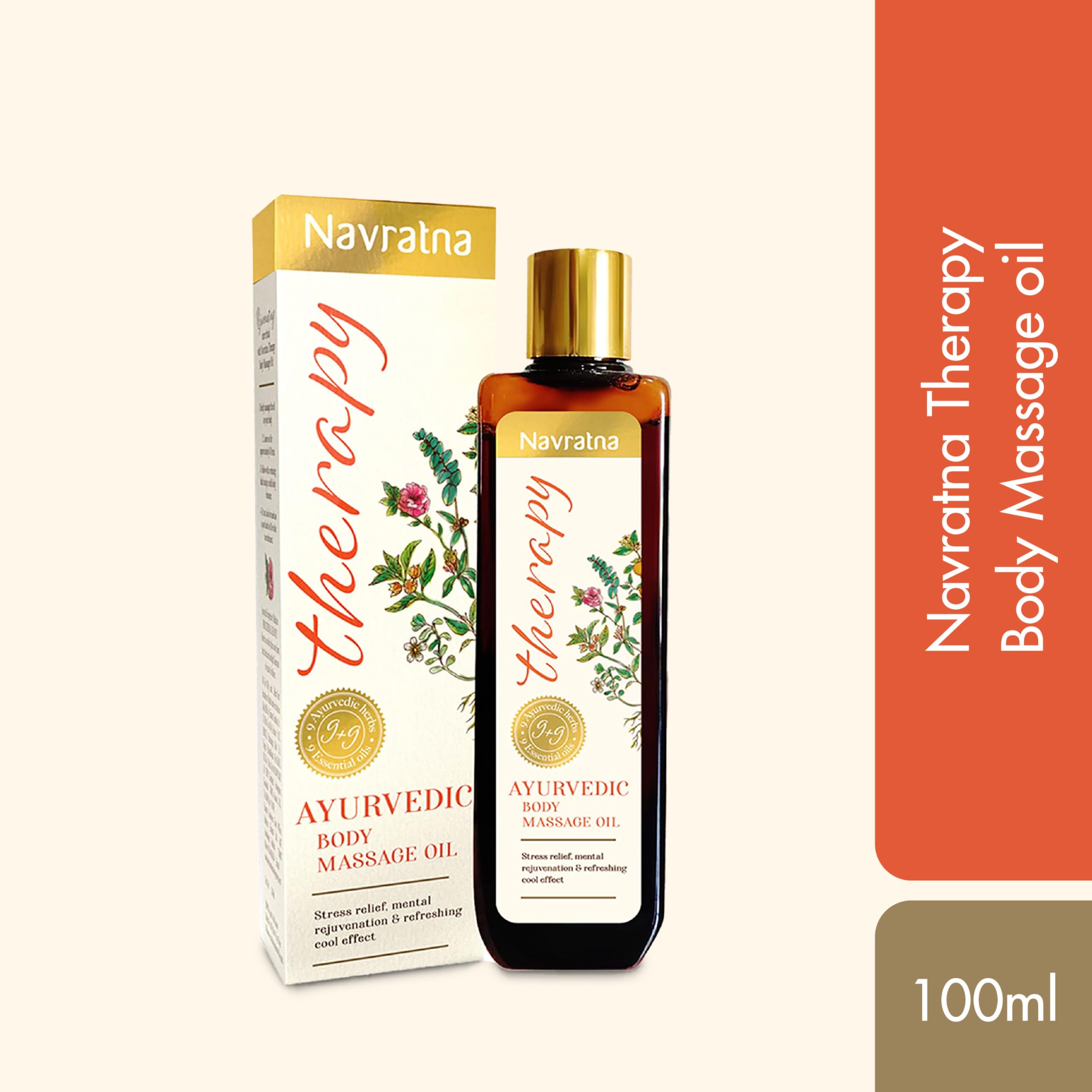 Crafted with care using a special mix of 9 Ayurvedic herbs and 9 aroma therapy oils the Navratna Therapy Body Massage Oil is like a wellness treasure chest. It taps into the calming power of ashwagandha the refreshing vibes of Brahmi the delightful scent of orange oil and the soothing feel of eucalyptus oil. Together they team up in this ayurvedic stress relief oil to help you deal with stress and feel refreshed. Just a quick body oil massage with this rejuvenating massage oil can melt away the knots in your muscles and make your mind feel calm and peaceful.