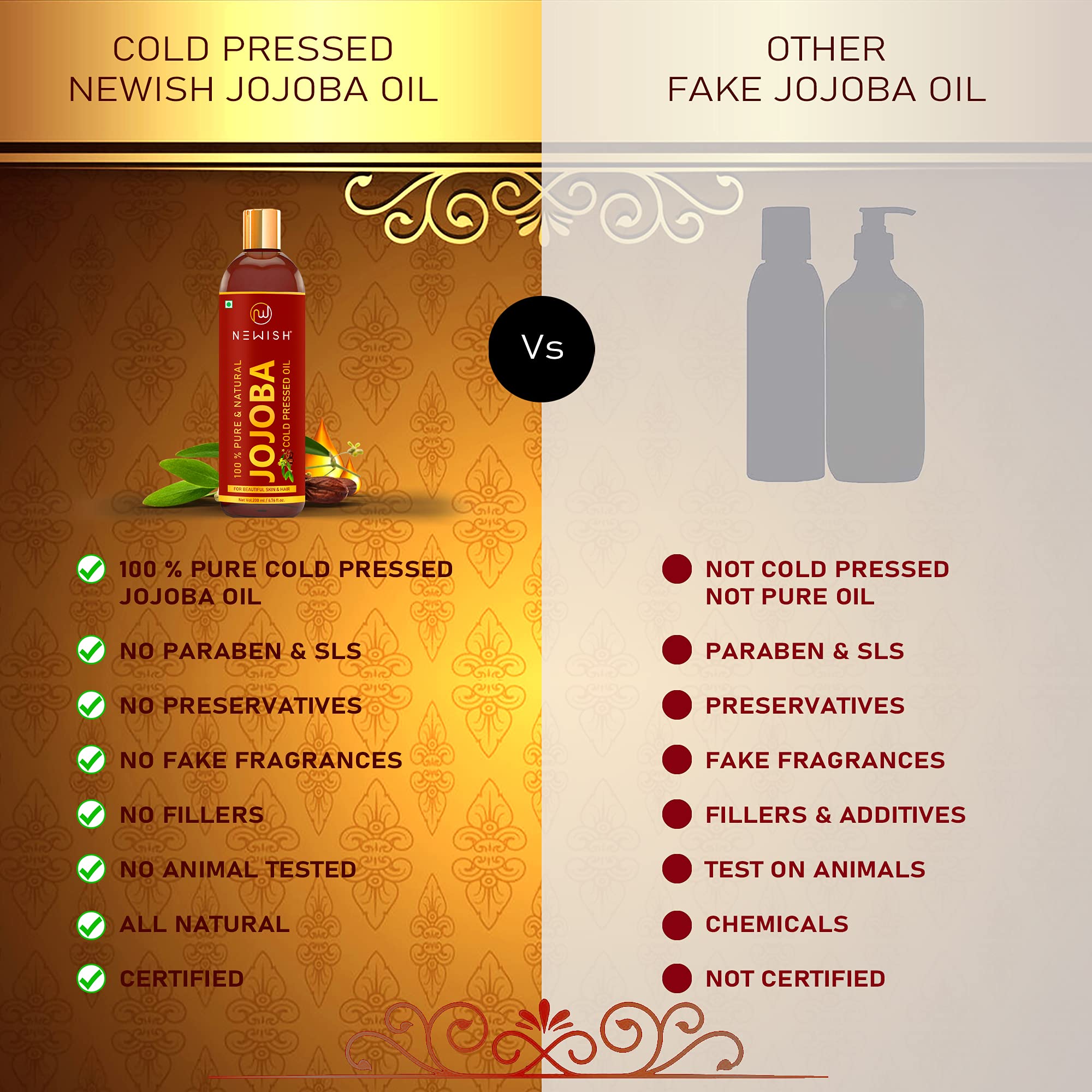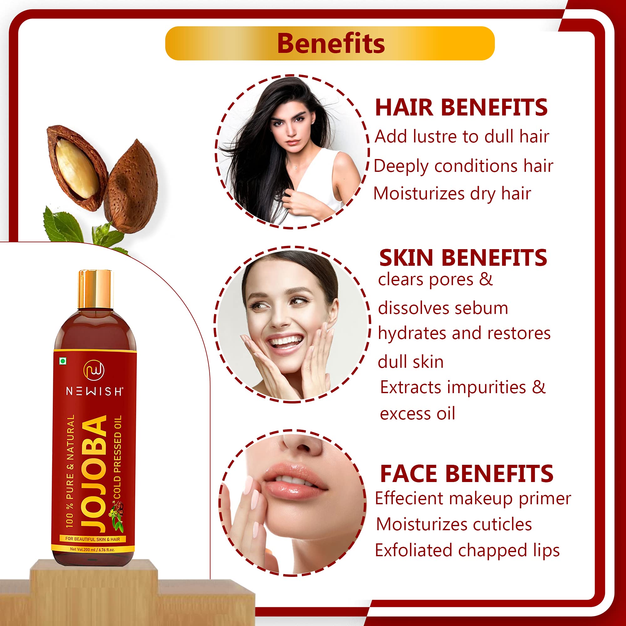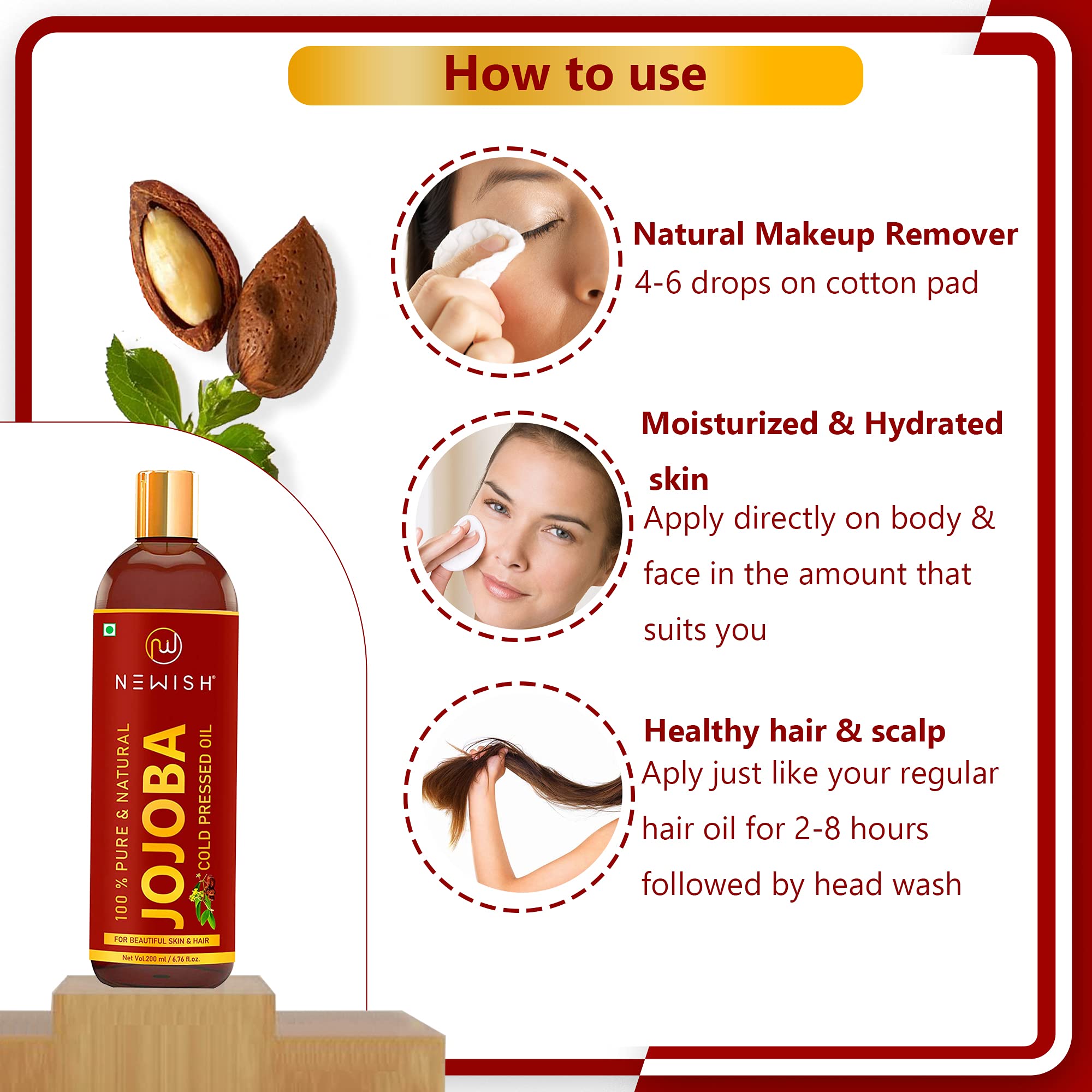 Newish Jojoba oil has an oily composition so it can be used as a moisturizer. It can also be added to hair conditioners to give you added protection against dryness breakage and split ends. The oil can also moisturize the scalp and may be a dandruff remedy. Jojoba is rich in vitamins and minerals that nourish hair including vitamin C B vitamins vitamin E copper and zinc. Deeply-Hydrating Long-Lasting Moisturization Nutritious for Skin Anti-Aging Jojoba is full of nutrients like Vitamin E and B as well as antioxidants and minerals like chromium copper and zinc which all nourish and protect skin. Organic cold-pressed Jojoba Oil has the highest level of antioxidants and nutrients. Because it is the perfect moisturizer Jojoba can help slow down the appearance of aging and help to fade fine lines and wrinkles. In dermatological tests it was shown that Jojoba Oil increases the skin's suppleness and the effect was still present as time passed. Tests also showed continued use of Jojoba Oil resulted in reducing superficial facial lines.
