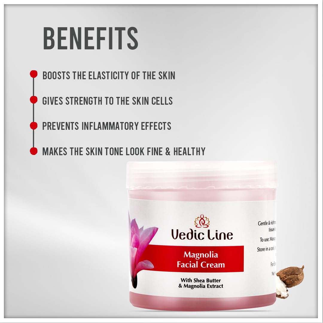 • Vedicline Magnolia Facial Cream is an excellent for dry skin by having magnolia as a main ingredient it provides a sheen and lustier to the face while o reducing spots and wrinkles. It moisturizes supports and saturates your face.