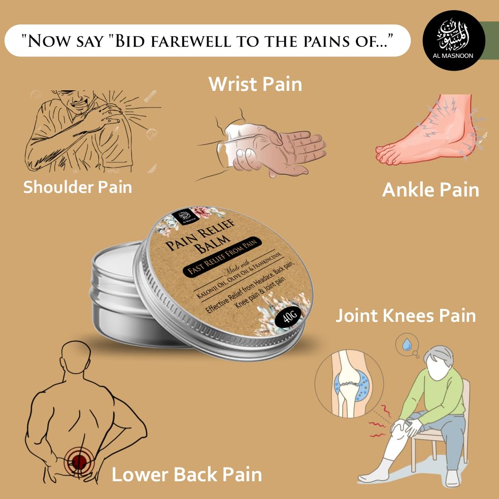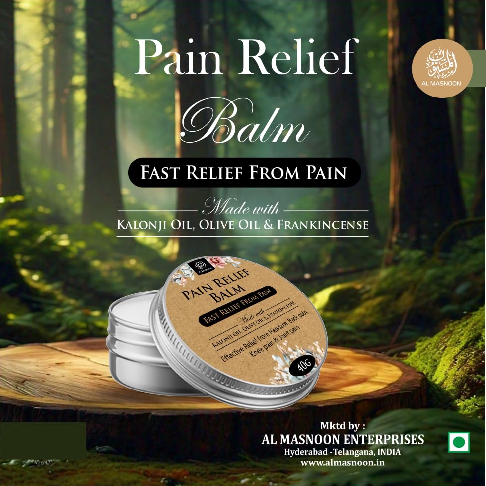 Alleviate joint pain and discomfort with Al Masnoon Pain Relief Balm expertly formulated with a blend of Kalonji (Black Seed) Olive Oil and Frankincense. This 40g balm is designed to provide instant relief and soothing comfort for sore and aching muscles making it an essential addition to your wellness routine.Al Masnoon Pain Relief Balm combines the therapeutic benefits of Kalonji Olive Oil and Frankincense to offer a powerful solution for pain relief. Its blend of natural ingredients ensures effective and soothing relief making it a valuable addition to your daily wellness regimen.