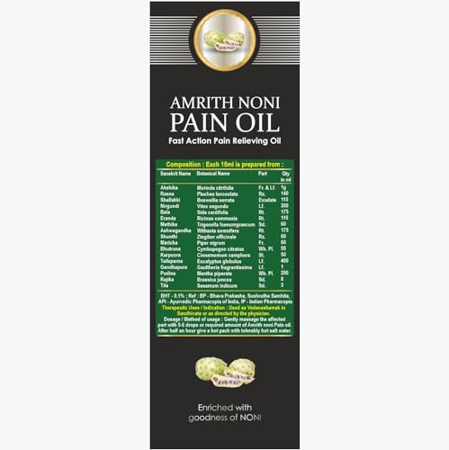 Experience the powerful blend of Ayurvedic herbs with Amrith Noni Pain Oil including Noni Nirgundi Rasna Maricha Shunti Shallaki Pippali Bala Ashwagandha Gokshura Nilgiri Gandhapurna Methika Karpoora Pudina and more. This oil offers effective pain management for various conditions like Back Pain Joint Pain Body Pain Knee Pain Ankle Pain Muscle Pain Shoulder Pain Low Back Pain Elbow Pain Leg and Arm Pain. Its versatile application helps in relaxing muscle spasms relieving muscle stiffness and addressing joint pain and swelling with its anti-inflammatory properties. The formula is natural in color non-sticky and non-greasy with no added preservatives. The easy-to-use design allows for a gentle massage of the affected area with 5-6 drops or the required amount of Amrith Noni Pain Oil. After half an hour a hot pack with tolerably hot salt water enhances the soothing effect.Rest assured the product is crafted in facilities certified by GMP using ingredients sourced from organic farms and holds ISO certifications ensuring quality and reliability. Elevate your pain relief experience with Amrith Noni Pain Oil.