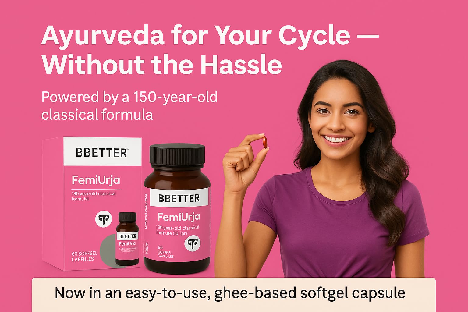BBETTER FemiUrja is inspired by Saptasaram Ghrutham a revered classical formulation used for centuries to promote female reproductive and digestive balance. Traditionally consumed as medicated ghee this powerful formula is now reimagined in softgel form retaining its bio-enhancing potential without the heaviness or hassle.With key herbs like Lasuna Sunthi and Punarnava FemiUrja promotes deep internal cleansing and supports healthy hormonal function through enhanced metabolism and digestive balance. Our ghee-based delivery system enhances absorption while providing gentle nourishment to reproductive tissues making FemiUrja ideal for use during periods of hormonal transition cycle irregularities or digestive disturbances associated with the menstrual cycle.