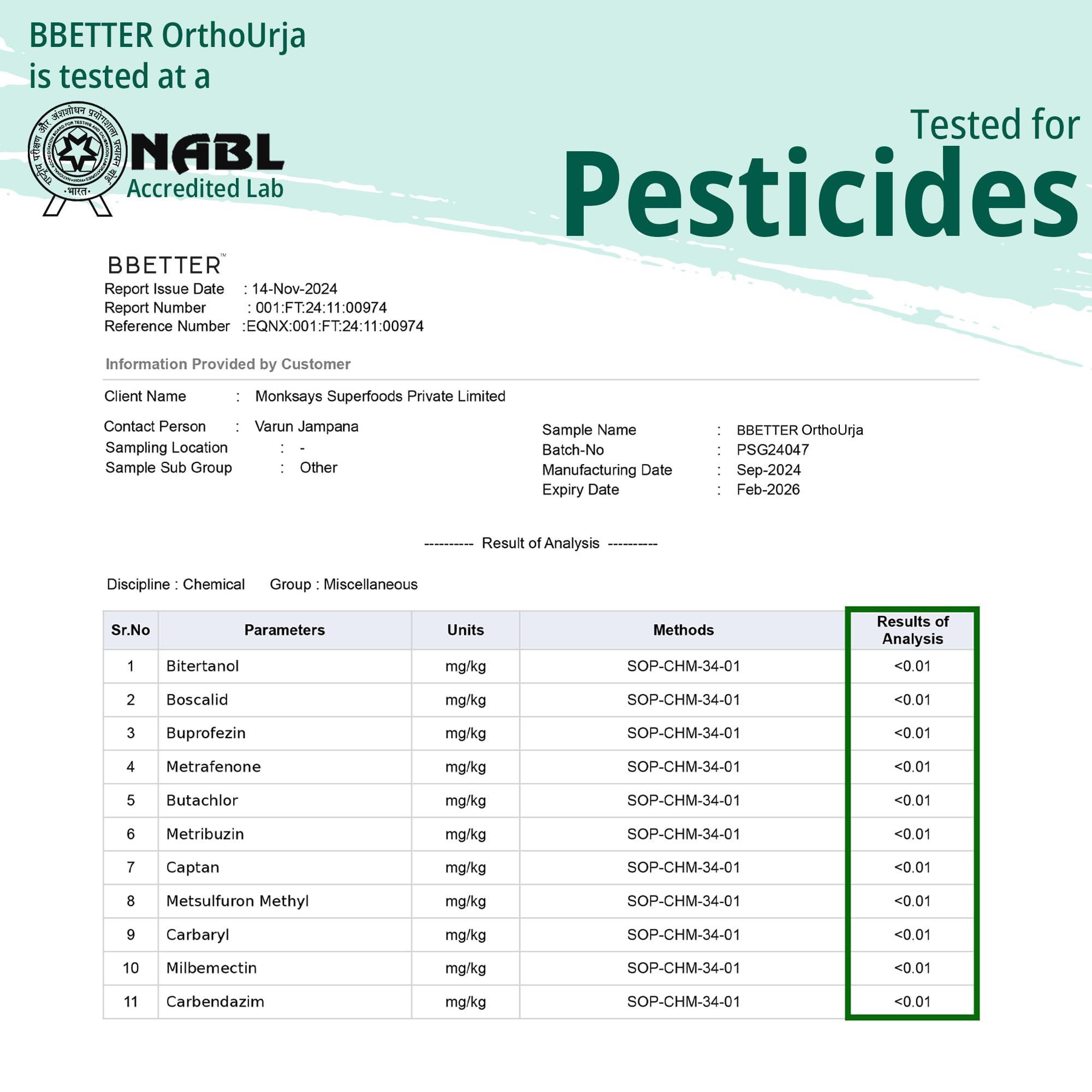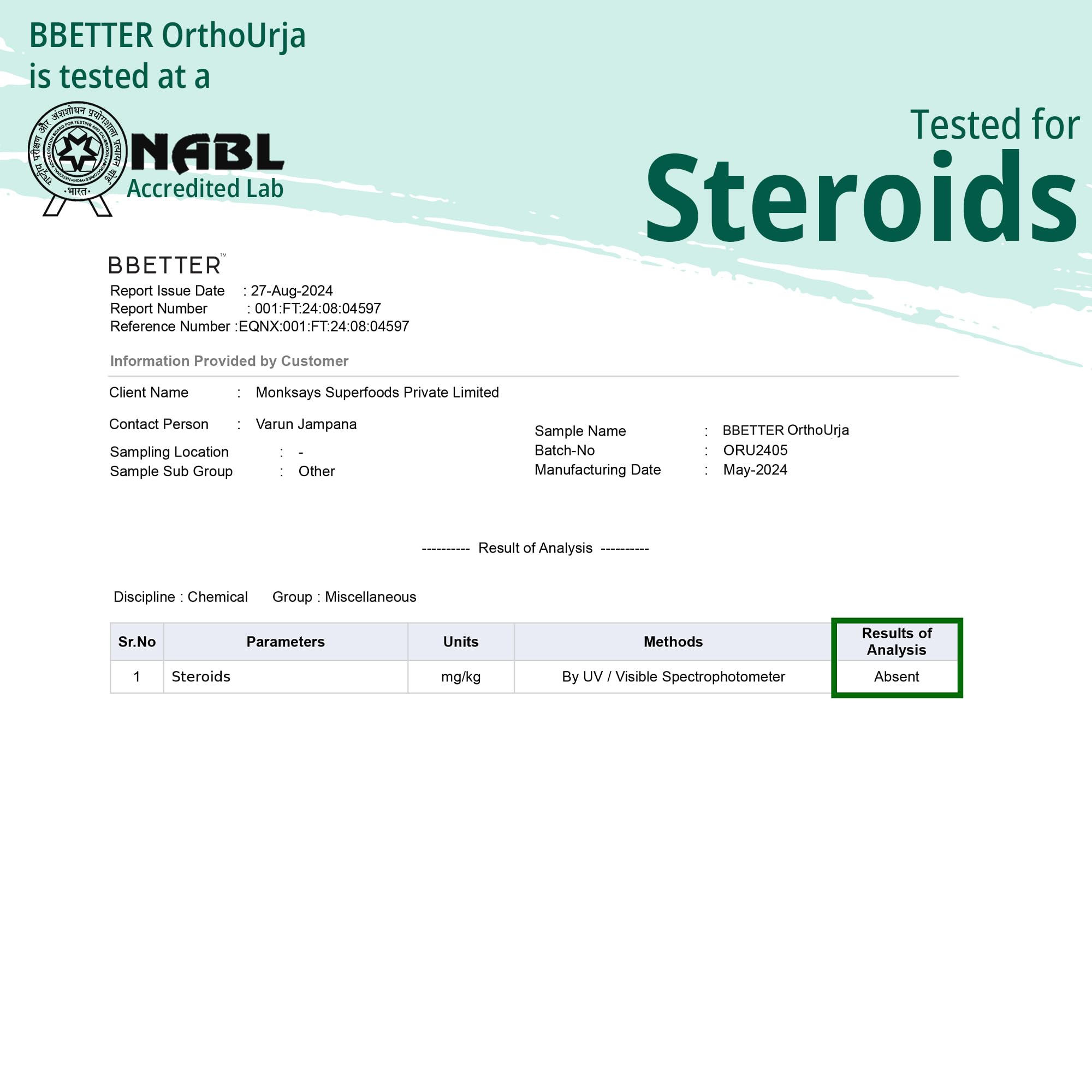 BBETTER OrthoUrja has been thoroughly tested in NABL-accredited labs meeting all essential quality parameters to ensure its reliability and effectiveness.