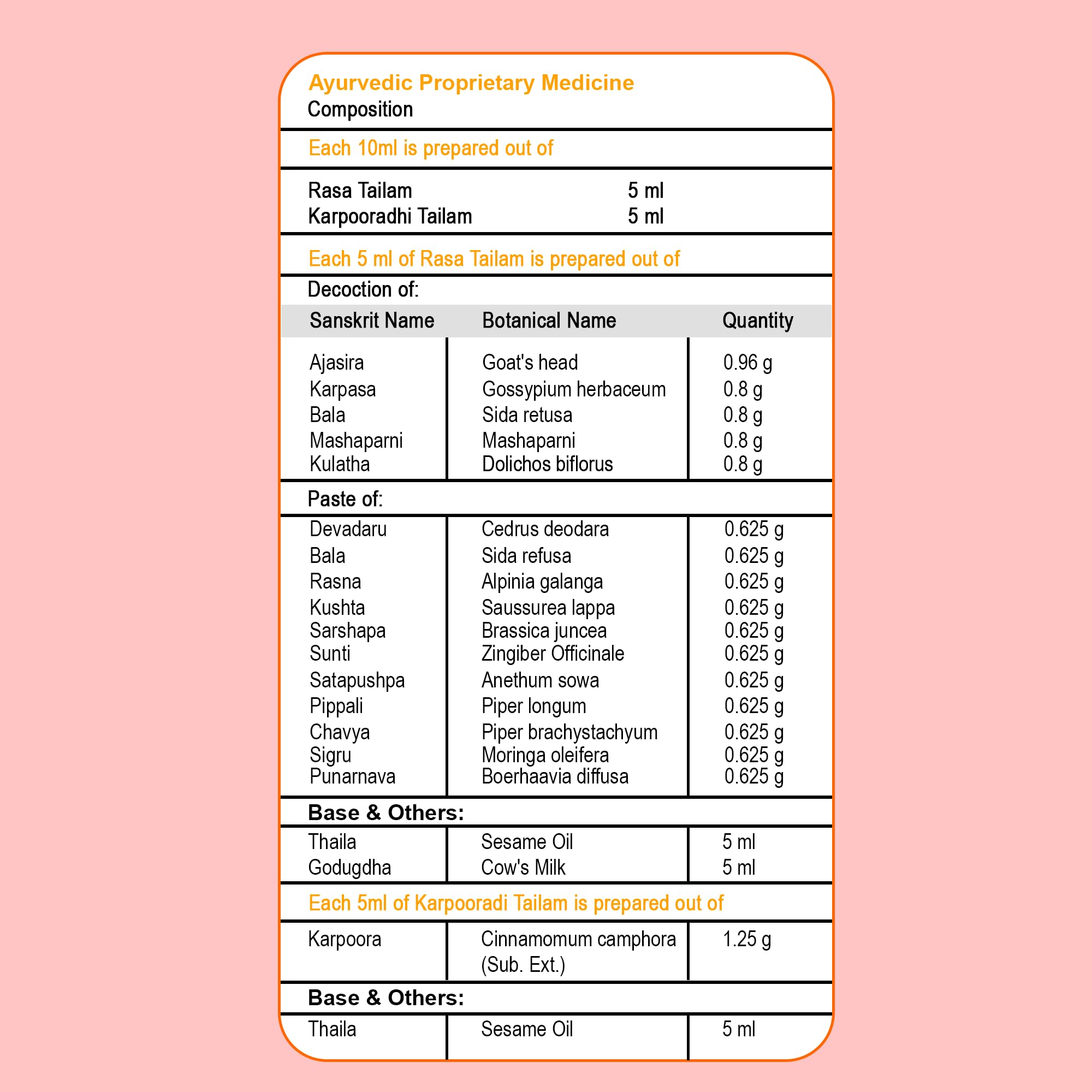 BBETTER Spinal Tejas Taila for Cervical and Spinal Pain Management is a specially formulated Ayurvedic oil combining the therapeutic benefits of Rasa Thailam and Karpooradi Thailam designed to provide effective relief from cervical and spinal discomfort.It helps reduce stiffness and improve mobility in the cervical and spinal regions. A potent Ayurvedic oil Karpooradi Thailam contains camphor known for its cooling and soothing effects. It provides quick relief from pain and helps relax the muscles improving circulation in the affected areas.This formula combines tradition with innovation to provide effective relief from persistent backaches neck pain and cervical stiffness. BBETTER Spinal Tejas penetrates deeply to soothe inflammation relieve tension and alleviate pain associated with cervical and spinal discomfort to treat conditions involving deep tissue pain and inflammation. It helps reduce stiffness and improve mobility in the cervical and spinal regions. Unlike conventional pain relievers that may come with unwanted side effects this Ayurvedic formula is safe for regular use combining traditional Ayurvedic herbs and oils. With regular use you can experience lasting relief and regain your freedom. Welcome a brighter more active future. Unlock the potential of Ayurvedic healing today with BBETTER Spinal Tejas.