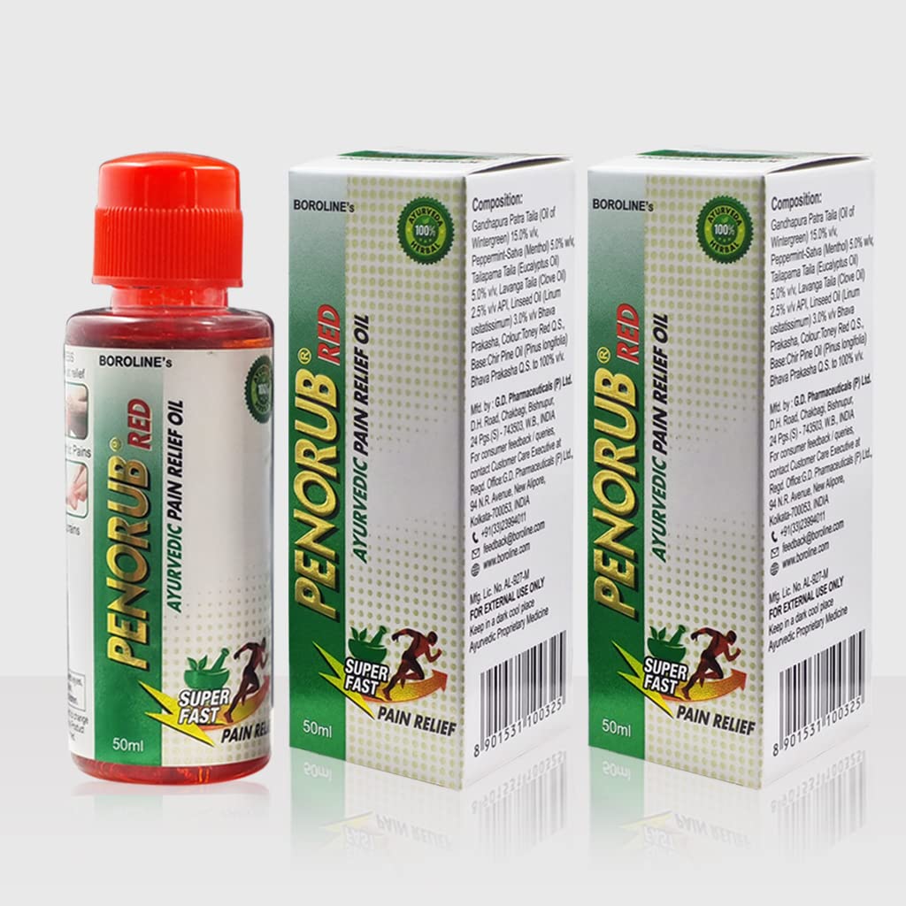 BOROLINE Penorub Red Ayurvedic Pain Relief Oil 50 ml X 3 - Muscle Knee Back Pain Relief | Benefits of Oil of Wintergreen Peppermint oil Eucalyptus oil Clove oil Linseed oil (Pack of 3)