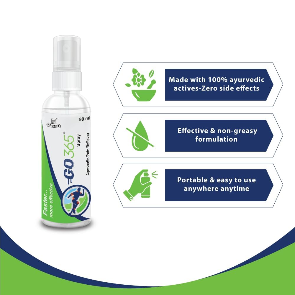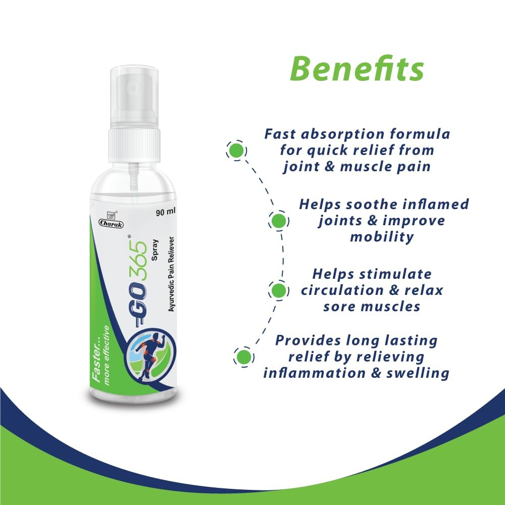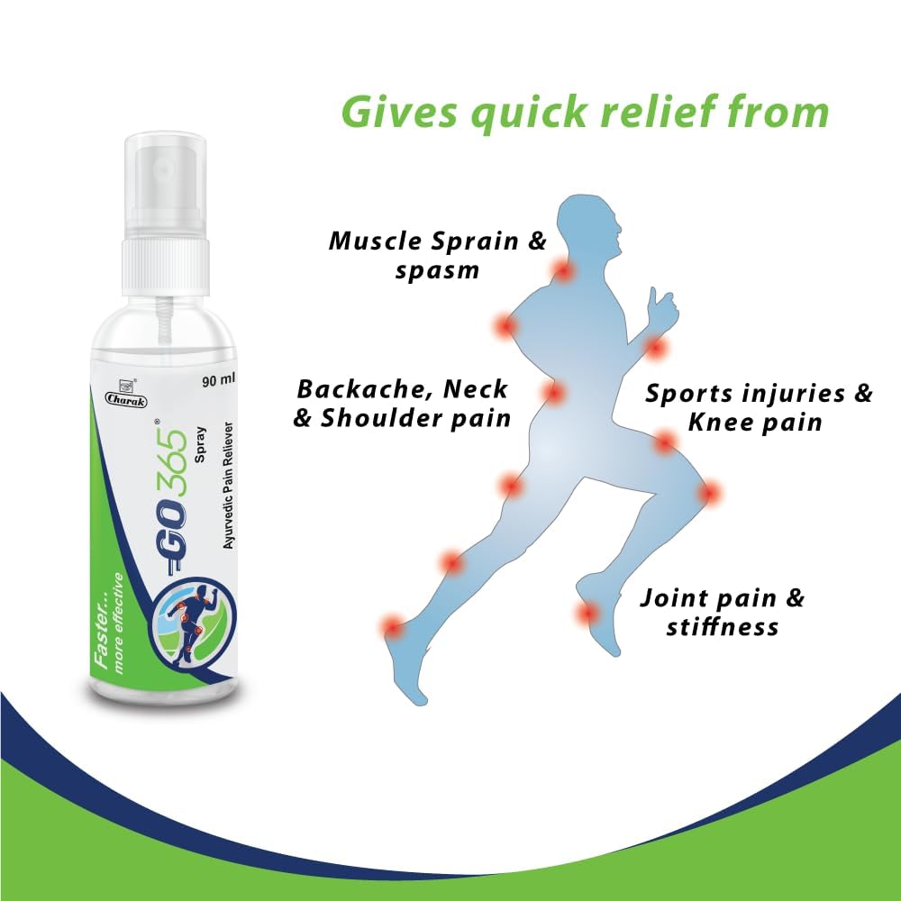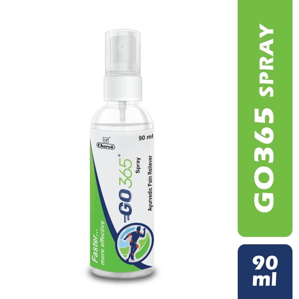Charak Go365 Pain Reliever Spray|For Back PainMuscle PainKnee PainJoint Pain&Stiffness|For Sports&Gym Related Injuries Each 90Gm(Pack Of 1)