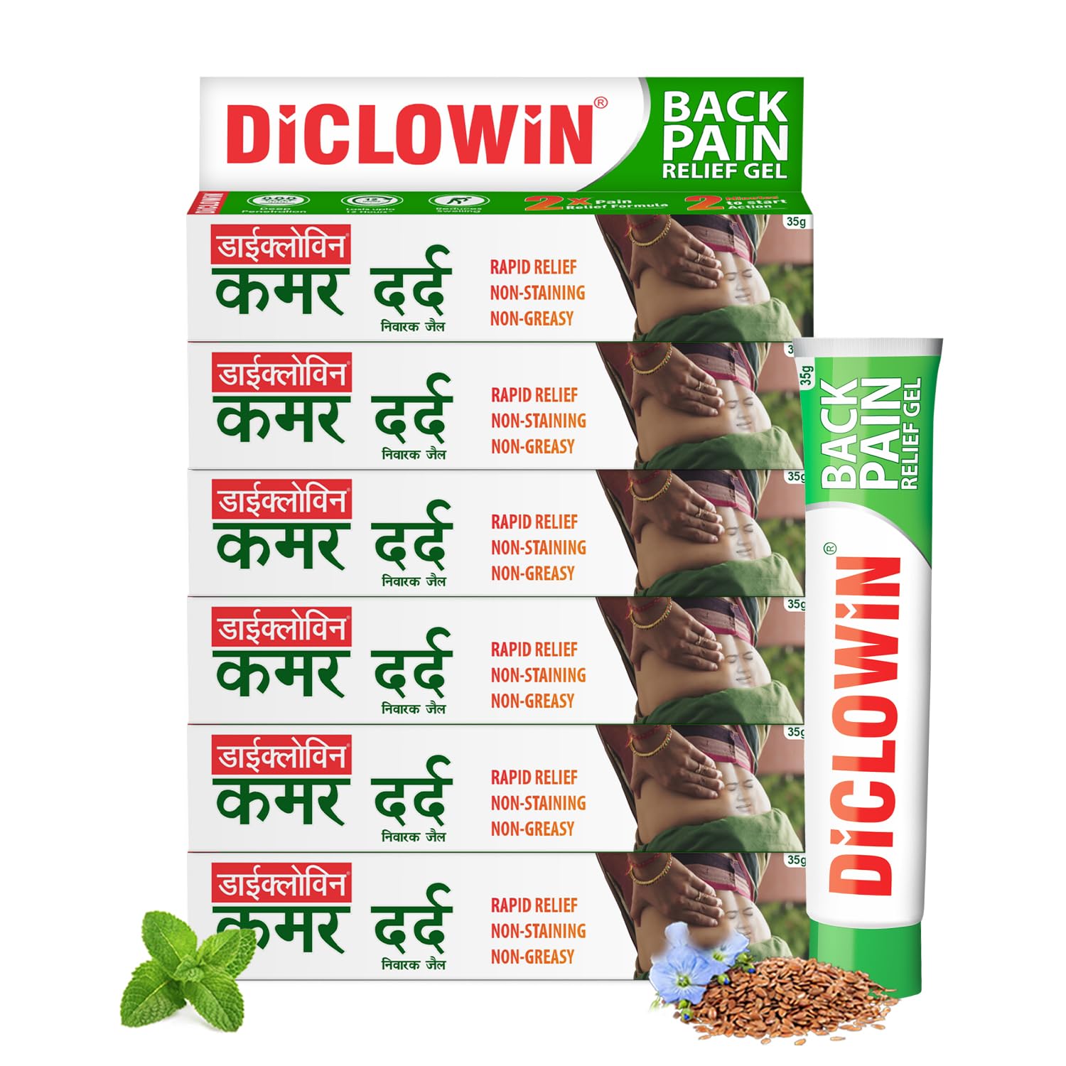 DiCLOWiN Back Pain Relief Gel (35gm x 6) | Suitable for Back Neck & Shoulder Pain Sports & Gym related injuries | Powerful Quattro Formulation | Non Greasy Non Staining and Fast Absorbing
