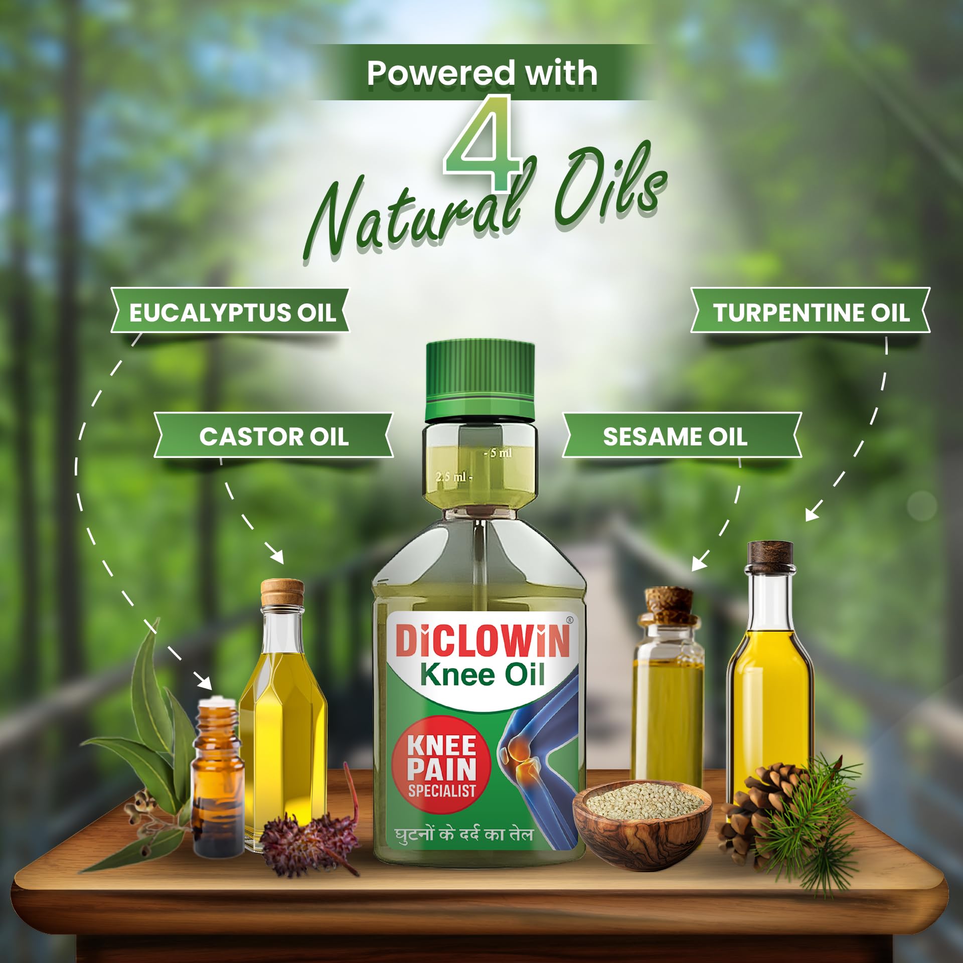 Powerful combination of 4 Knee Pain improving oils: Castor Eucalyptus Turpentine & Sesame Oil.
