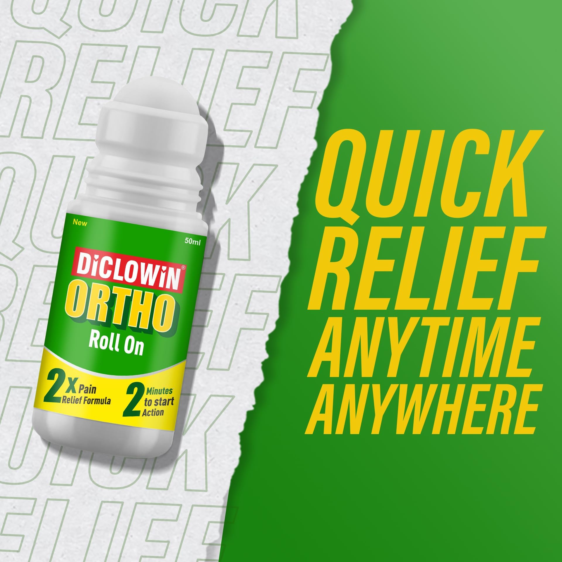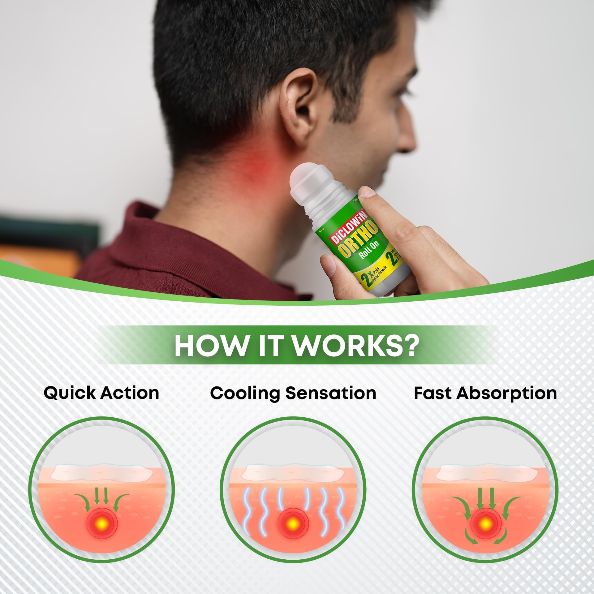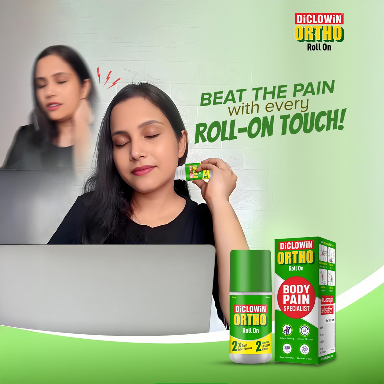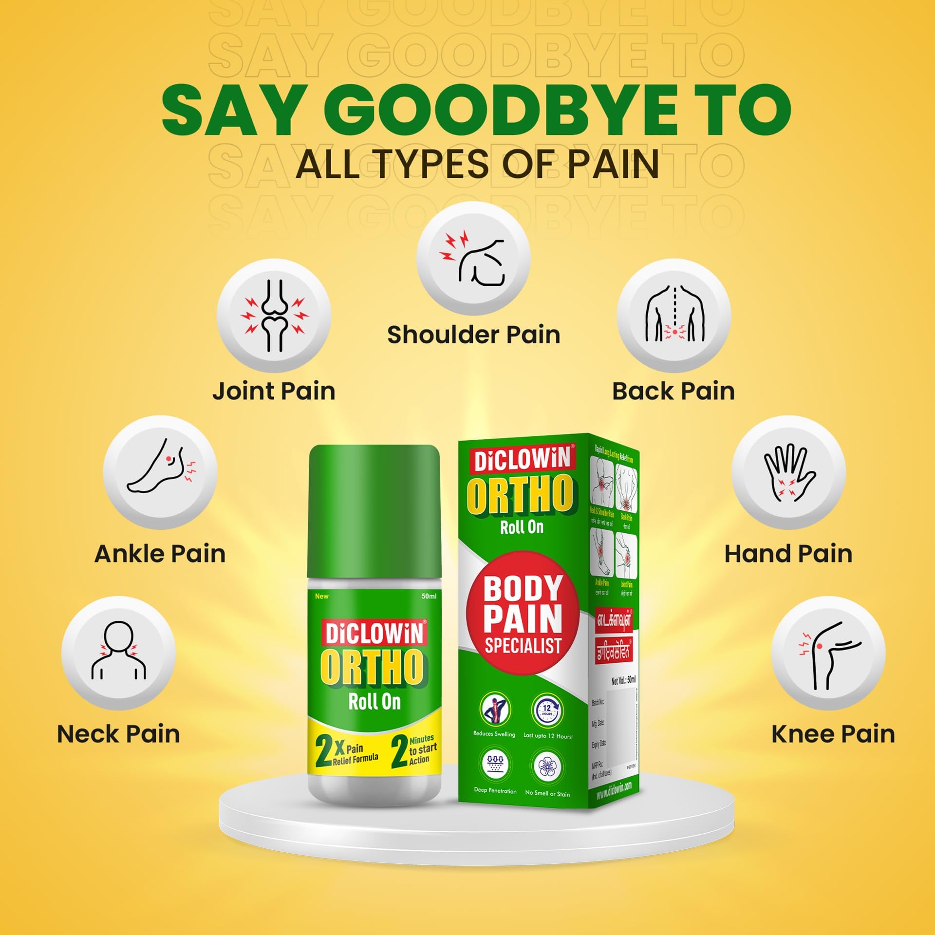 Diclowin Ortho Roll-On is a specially formulated topical pain relief solution crafted to alleviate muscle and joint discomfort swiftly and effectively. Unlike traditional oral medications this innovative roll-on application ensures direct and targeted relief precisely where you need it most without the hassle of pills or messy creams.Don't settle for temporary solutions. Roll-On not only offers immediate relief but also continues to work over time providing lasting comfort that helps you stay active throughout the day.Say goodbye to waiting for pills to kick in or enduring messy creams. Diclowin Roll-On provides rapid relief right at your fingertips allowing you to get back to your activities without delay. Travel friendly Whether you're hitting the gym exploring the great outdoors or simply tackling your daily routine Diclowin Roll-On is your portable solution for on-the-go pain relief. Slip it into your bag or pocket and enjoy relief whenever and wherever you need it.Thanks to its convenient roll-on design you can precisely target the affected areas with ease. No more guesswork â simply apply directly to the source of your pain for instant relief.