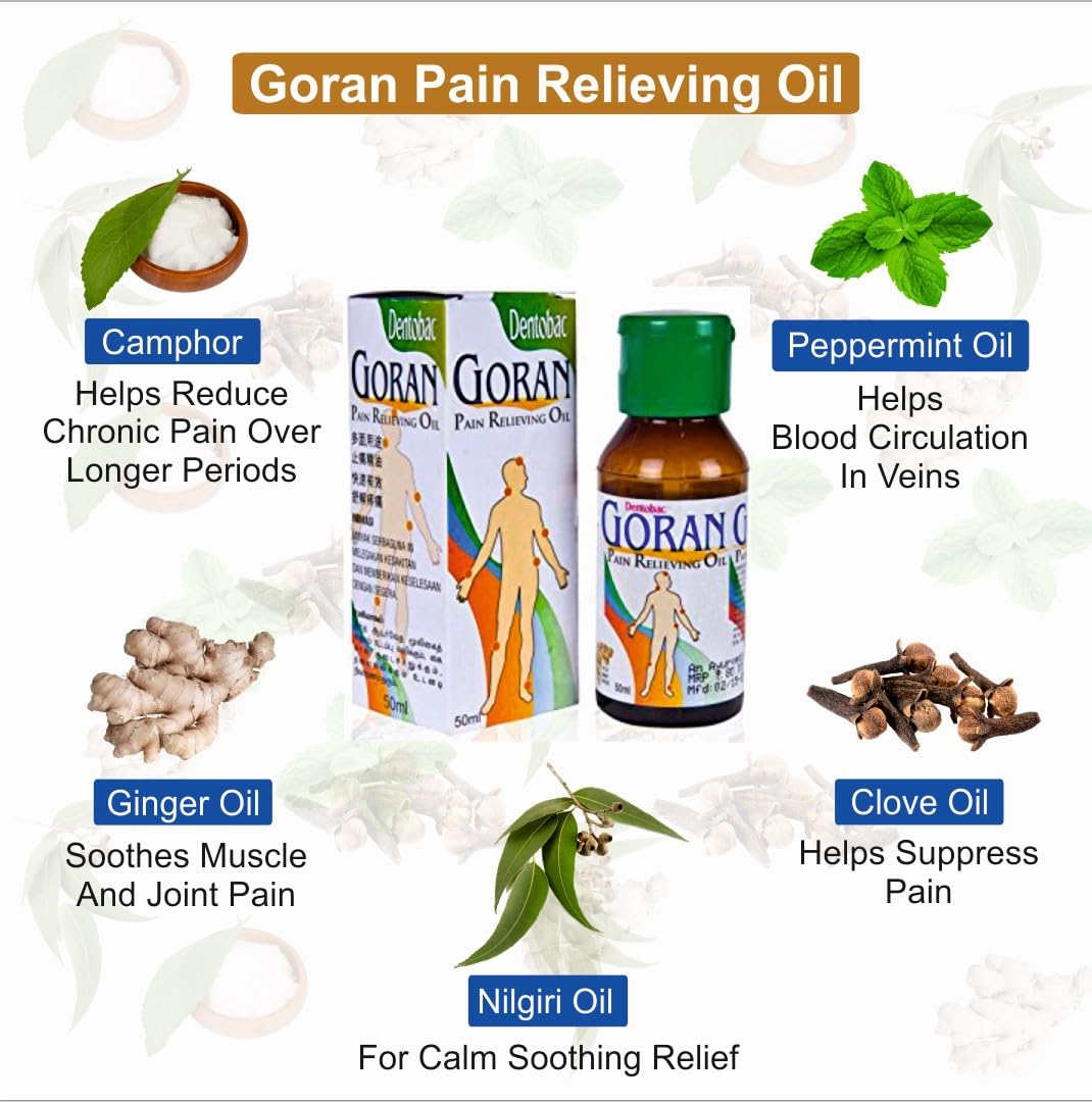 Goran Ayurvedic Pain Relief Oil is a versatile oil designed to help ease various types of discomfort. It combines natural Ayurvedic ingredients that are traditionally used for their soothing properties making it an option for people seeking relief from everyday aches and pains. This oil can be applied to the joints and muscles to address discomfort that might arise from activities like exercise long hours of sitting or age-related stiffness. It is also often used for relieving back and neck tension by massaging into the affected areas. The oil has a gentle warming effect that can help ease tightness and stiffness allowing for greater movement and flexibility. Goran Ayurvedic Pain Relief Oil is also used to ease minor headaches and migraines. When applied to the temples or forehead it is thought to provide comfort by helping to improve circulation in the area. The oil may also be used for muscle cramps or minor strains offering a soothing touch to tight or overexerted muscles. In addition it is sometimes applied for skin irritations such as minor cuts or insect bites thanks to the properties of its herbal ingredients. The oil is designed to be absorbed quickly into the skin without leaving a greasy residue making it easy to apply and use regularly. The 50ml set of 5 ensures you have a steady supply of the oil whether for home use or while traveling. With its compact size this oil is a convenient option to keep on hand for those seeking a natural approach to addressing various types of discomfort.