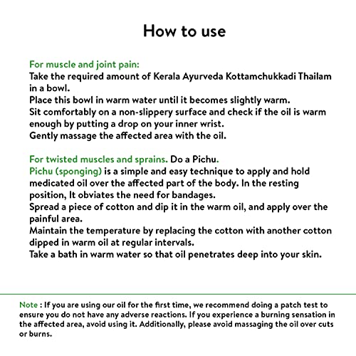 • Usage: Take the required amount of Kerala Ayurveda Kottamchukkadi Thailam in a bowl. Place this bowl in warm water until it becomes slightly warm. Sit in a comfortable position on a non- slippery surface and check if the oil is warm enough by putting a dr